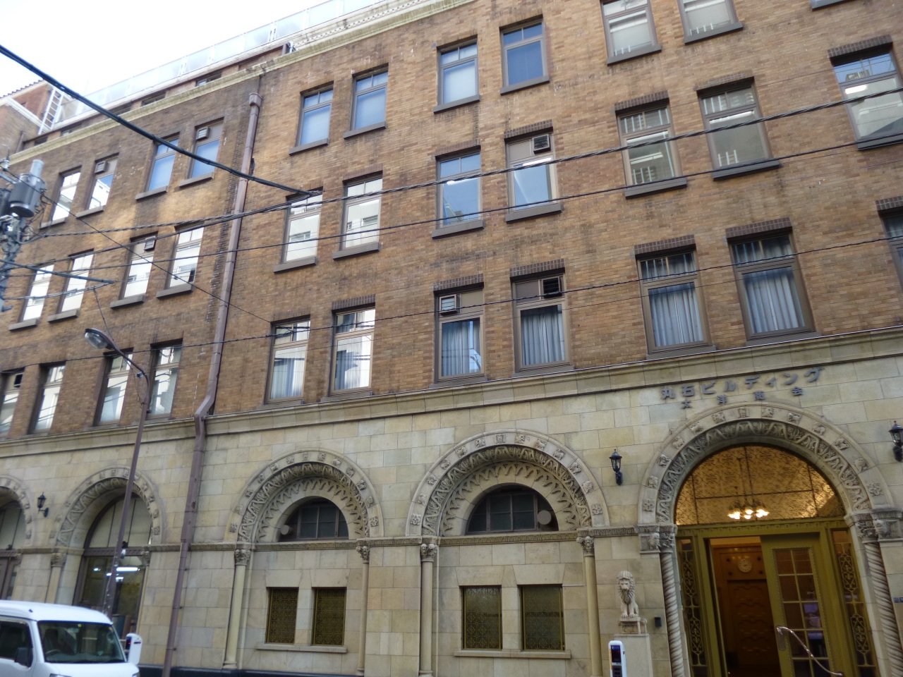 神田駅東口から南に徒歩3分ほど、裏通り沿いにある「丸石ビルディング」は、昭和6年竣工の歴史的なビルです。1階部分にはアーチを描いた窓が用いられ、アーチの周りには精緻な彫刻が施されています。あまりに大きなビルで、全景をフレームにおさめることが出来ないほどでした。
