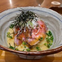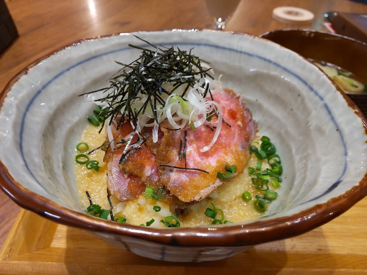 メインのどんぶりは、ごはん、とろろ、ローストビーフがのっています。お味噌汁付き。豆乳のレアチーズケーキも好きな味と食感。何より、混雑していなくて、ゆったりできるのがいいです。