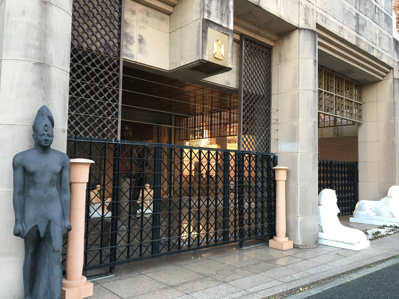 代官山エリアを散歩中、西郷山公園に向かう途中で、厳重な門とともに、スフィンクスの像などエジプトっぽいオブジェが置かれた建物が目に入ってきました。すぐ近くには、デンマークの大使館もありました。中に入ることはできませんが、ちょっとした旅行気分が味わえます。