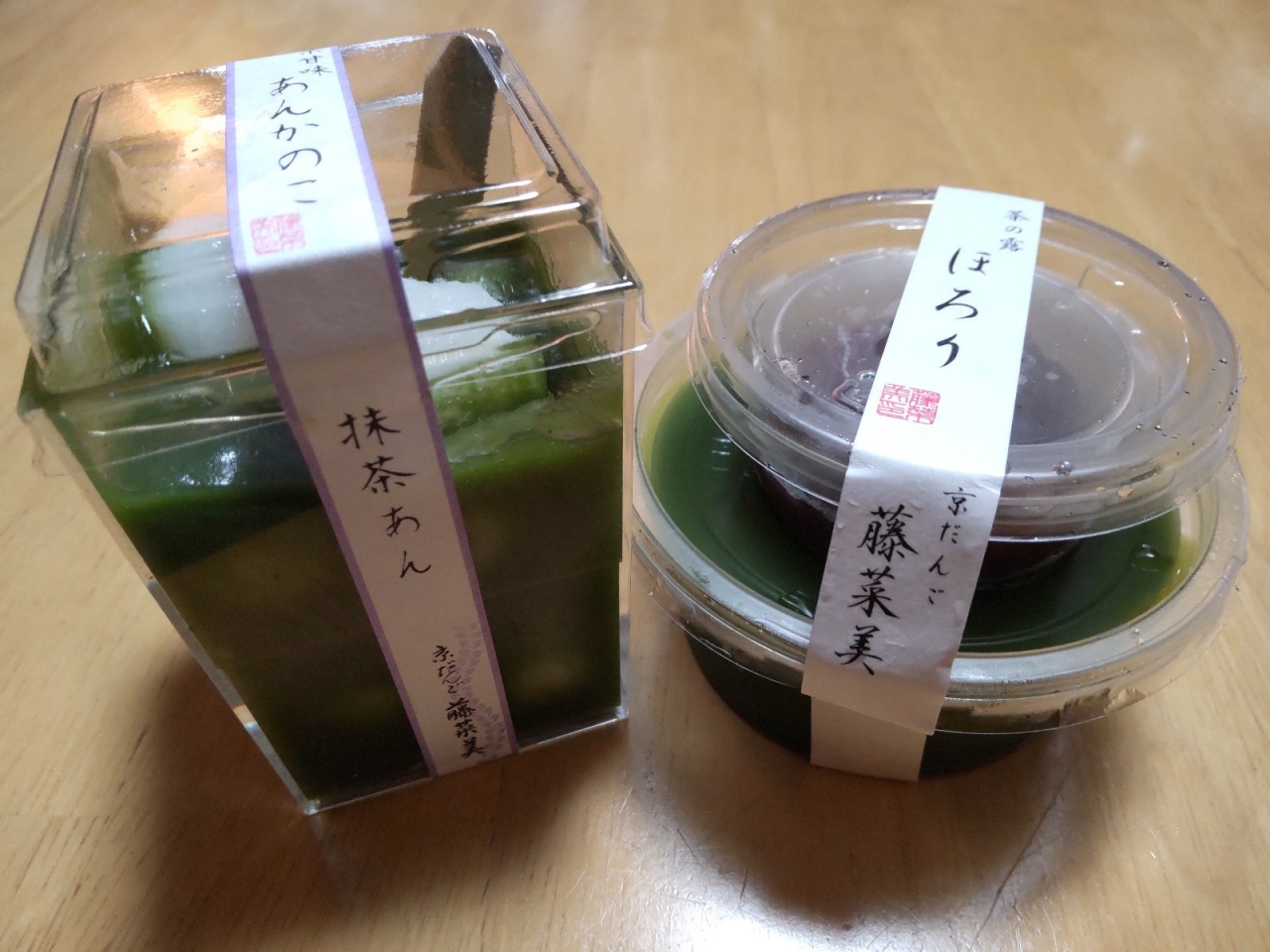 あんかのこは、四角いボックス入りのおだんご。たっぷりの抹茶あんが美味しい。ほろりは、抹茶のひんやりスイーツ。粒あんがついているのでそれとともに。フルフルの食感が大好き。