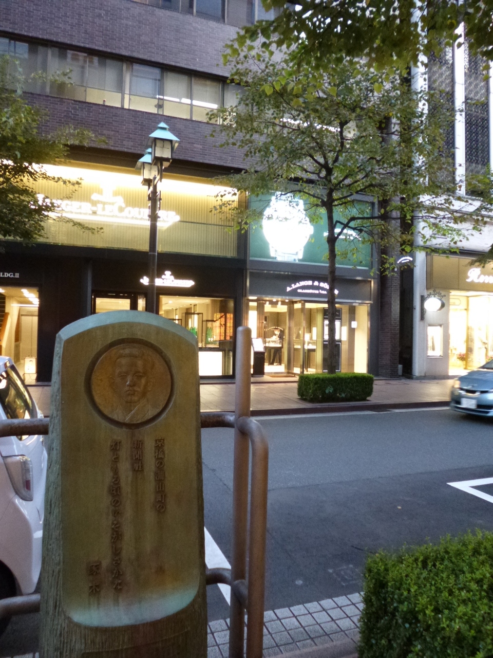 銀座の並木通り沿い、グッチブランドのイタリアンレストランの近くに、碑が立っています。ここには以前朝日新聞社があり、明治24年から27歳で亡くなる3年間、石川啄木が勤めていたそうです。その短い間に、啄木は「一握の砂」「悲しき玩具」など多くの名作を残したそうです。昭和48年に建てられた碑はブロンズ製で、木の幹の形をしています。啄木のレリーフと歌が刻まれています。