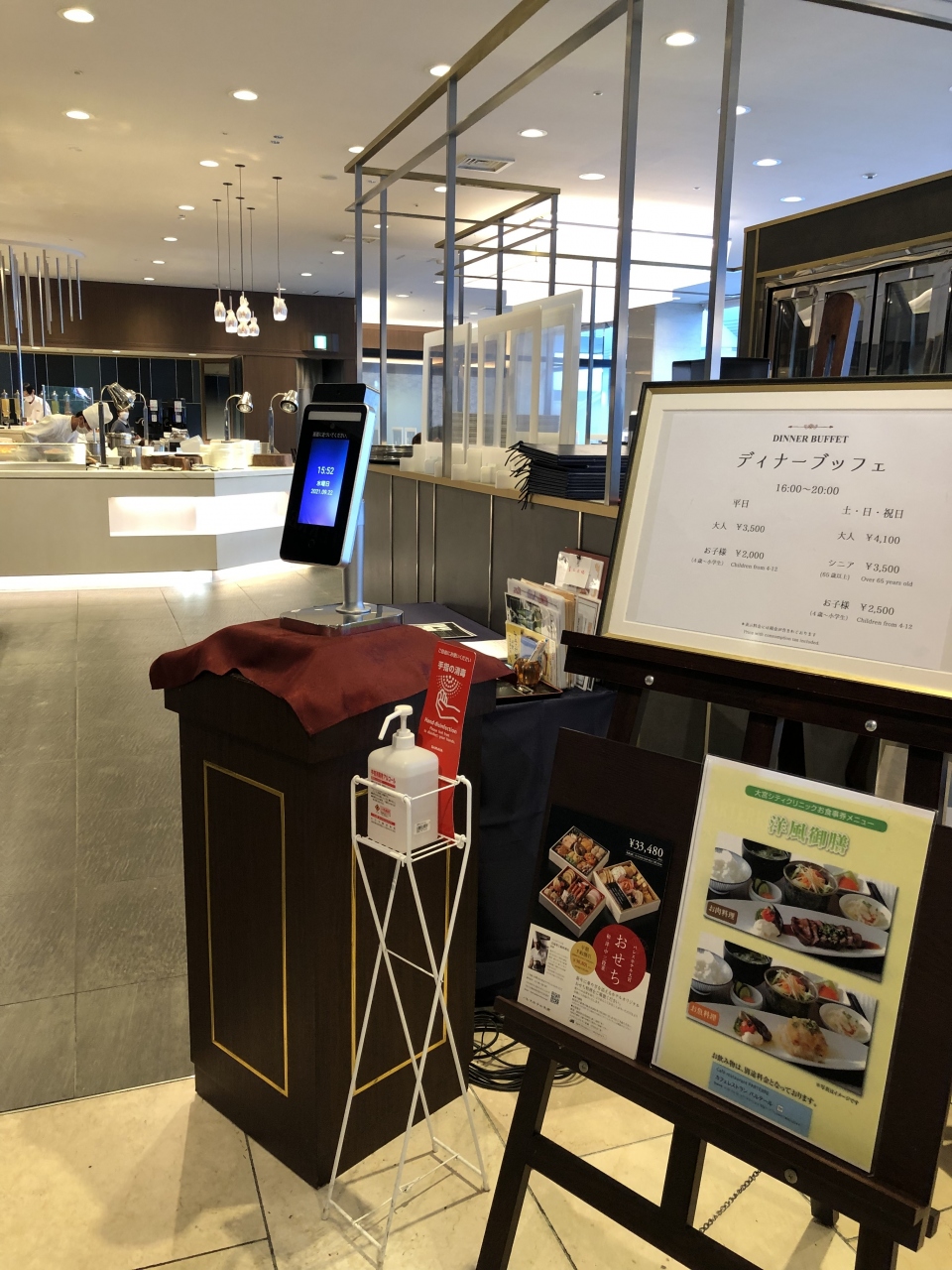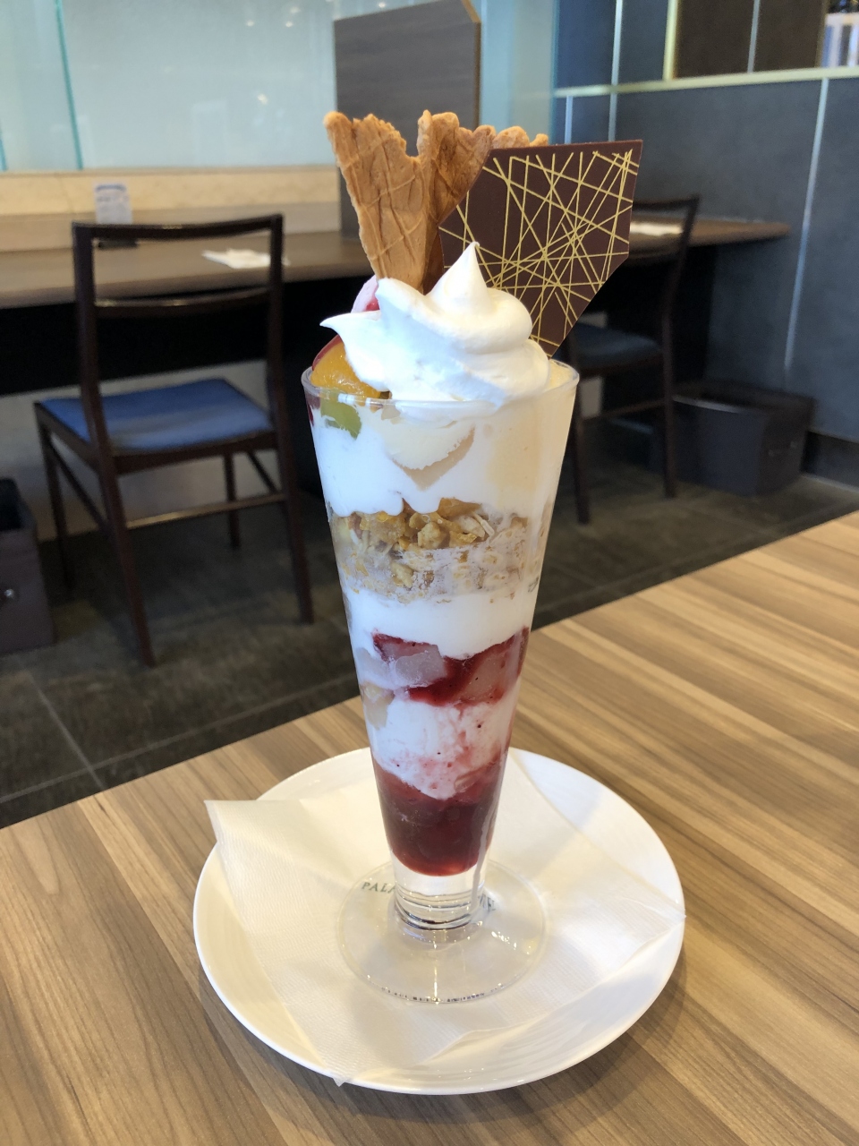 全く土地勘のない大宮駅でパフェを食べたくなり、ホテルだったらあるかしら?と思って入ったのがこちら。サロン ドゥ カフェをめざしていったのですが、コロナ対策でレストランの座席を間隔をあけて広々使っていて、カフェレストラン パルテールの方のテーブルに案内されました。
