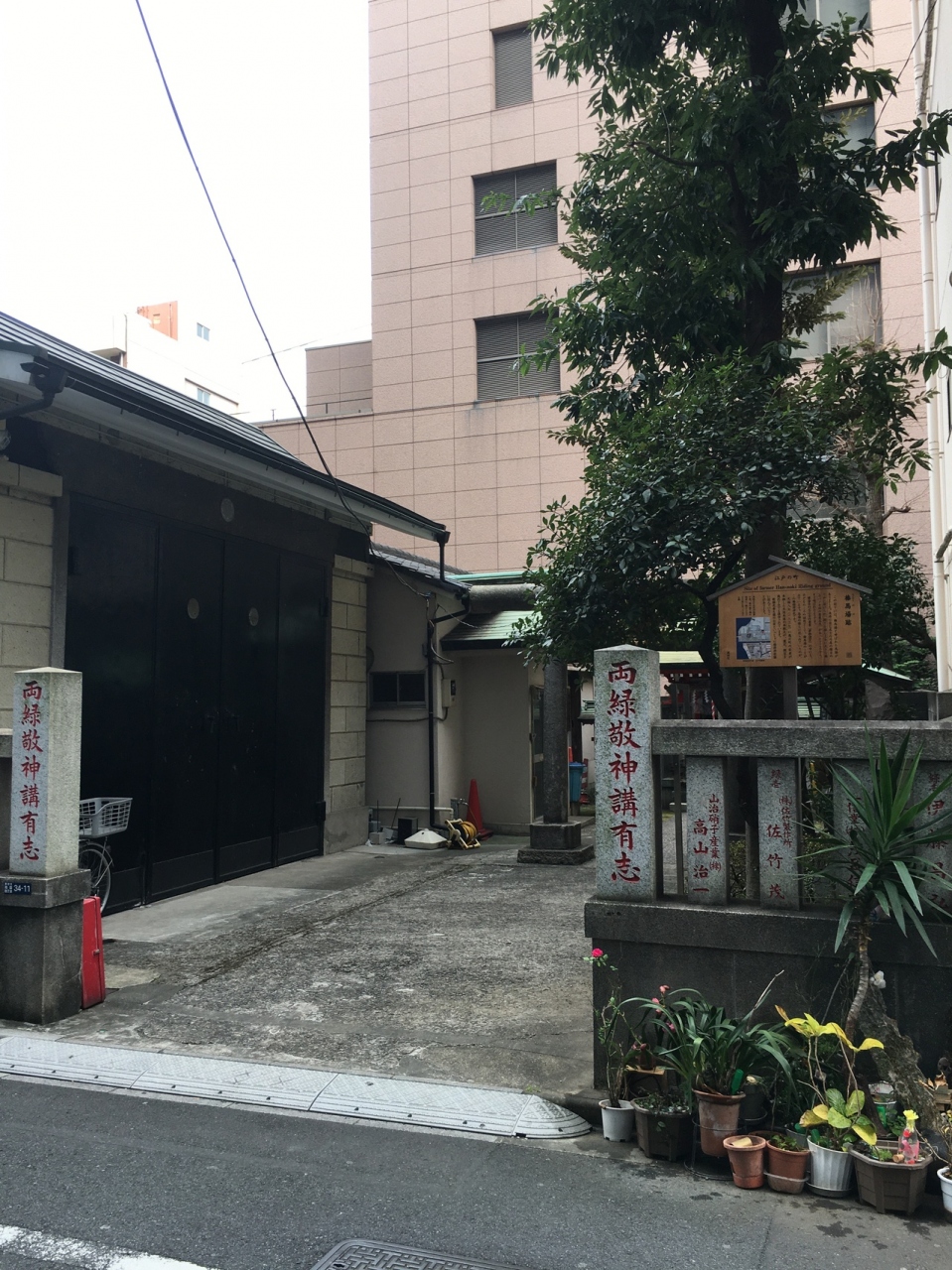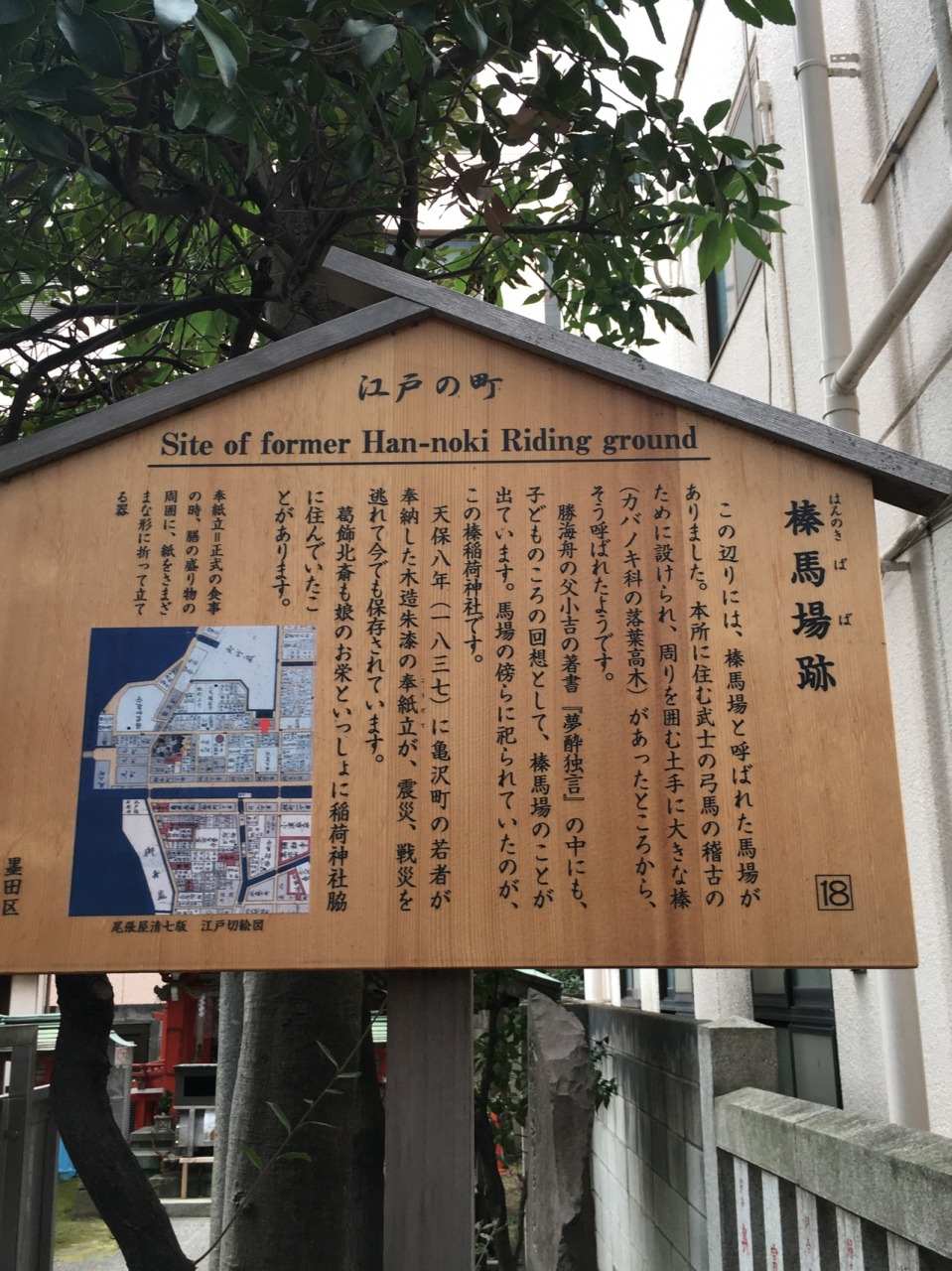 大通りから逸れた神社の前に板状の説明文がありました。本所には住む武士の弓場の稽古場として作られたようで、周りを囲む土手にカバノキがあったのでこの名称のようです。看板には勝海舟や葛飾北斎の文字もありました。