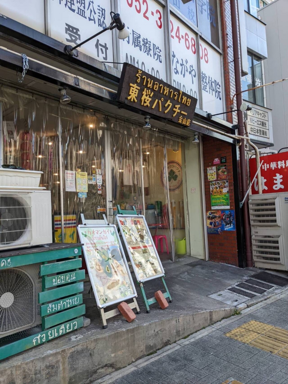 金山総合駅から歩いて5~6分位と少し離れたところに「東桜パクチー」はありました。タイ料理の専門店で、店内は、タイの街中にあるローカルな食堂のような雰囲気があって良かったです。ランチタイムも営業しており、ガパオライスなどを食べることができますが、味は本格的で美味しかったです。