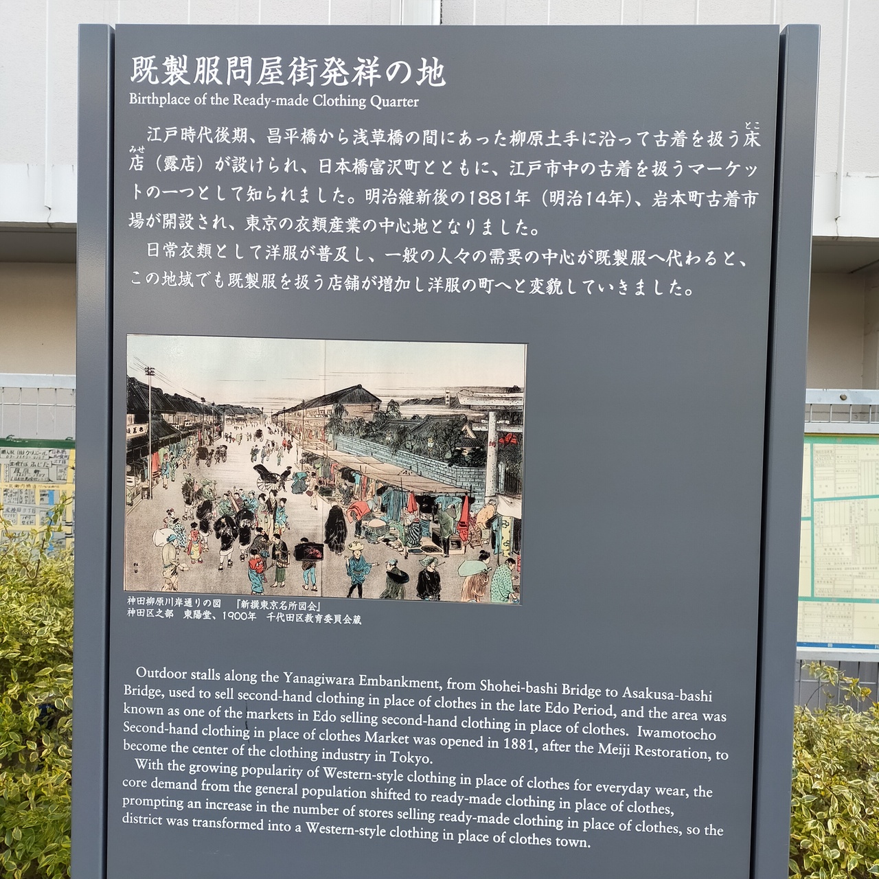 秋葉駅近く、和泉橋のたもとにある発祥の地です。現在は小さい公園になっています。問屋街といえば浅草橋ですが、隣駅の秋葉原周辺東神田からはじまっていたんだなと勉強になりました。この周辺で開催される問屋さんのバザーがあるのですが、ぜひ参加したいです!