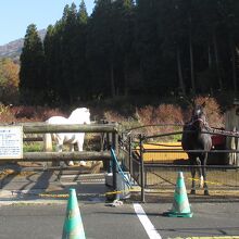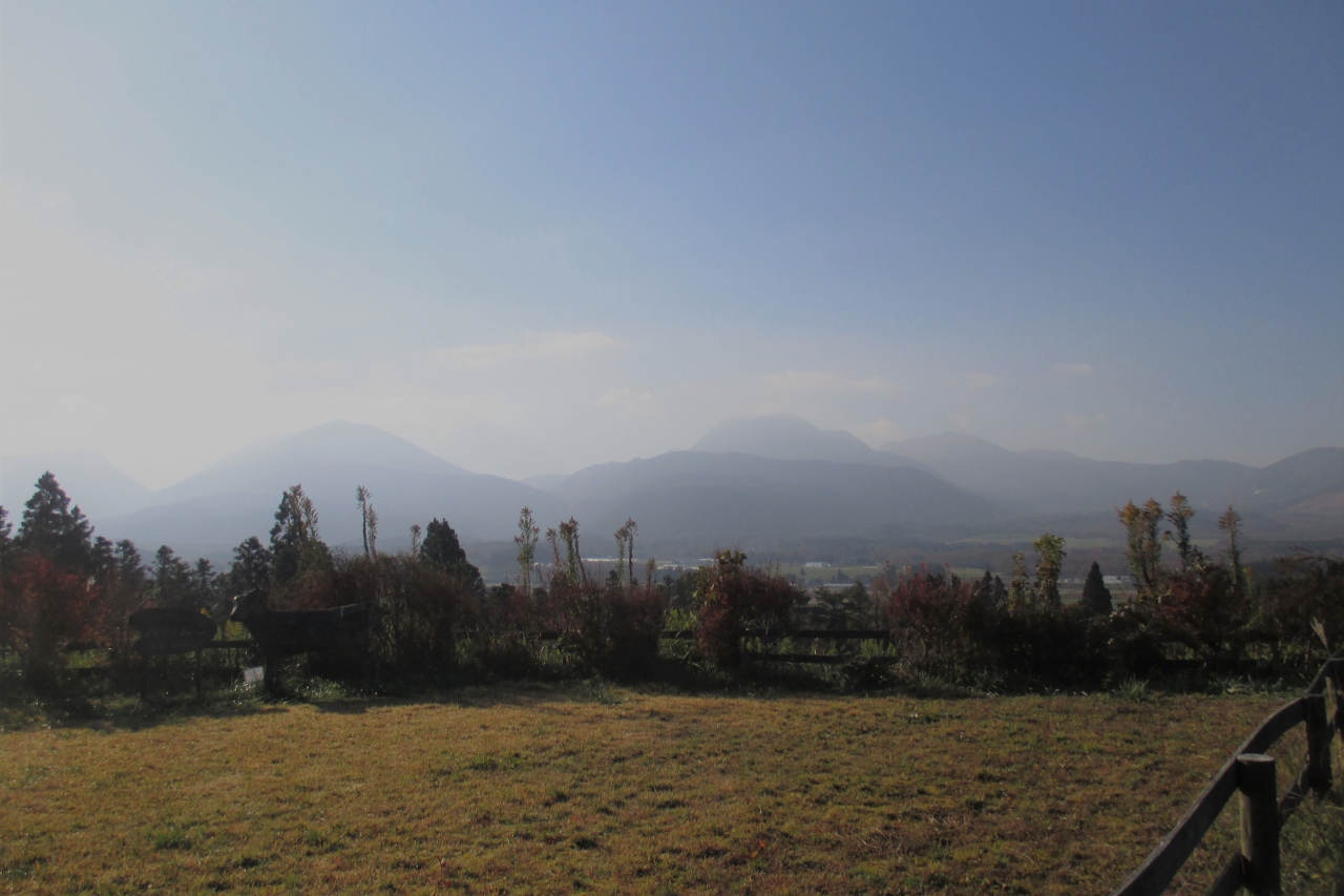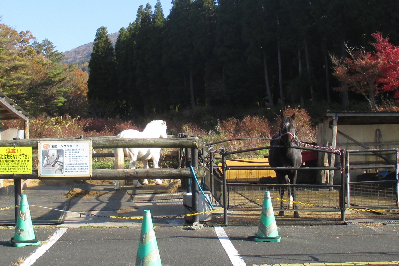 朝日台展望所からわずかに下ったところに農家レストラン・べべんこがありました。こちらでは駐車場横でお馬さんが飼われていました。中でも、がっちりとした白馬の「ハクバボーイ」君が目を惹きます。2014年生まれのばん馬です。2018年現在では白毛のばん馬は2頭しかいなくて、しかも、ばんえい競馬のレースで勝利をしたのはこのハクバボーイ君だけだそうです。余生というには早すぎますが、そんな経歴のハクバボーイ君はなぜここにいるのでしょうか?なお、ここからもくじゅう連山が良く見えました。