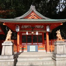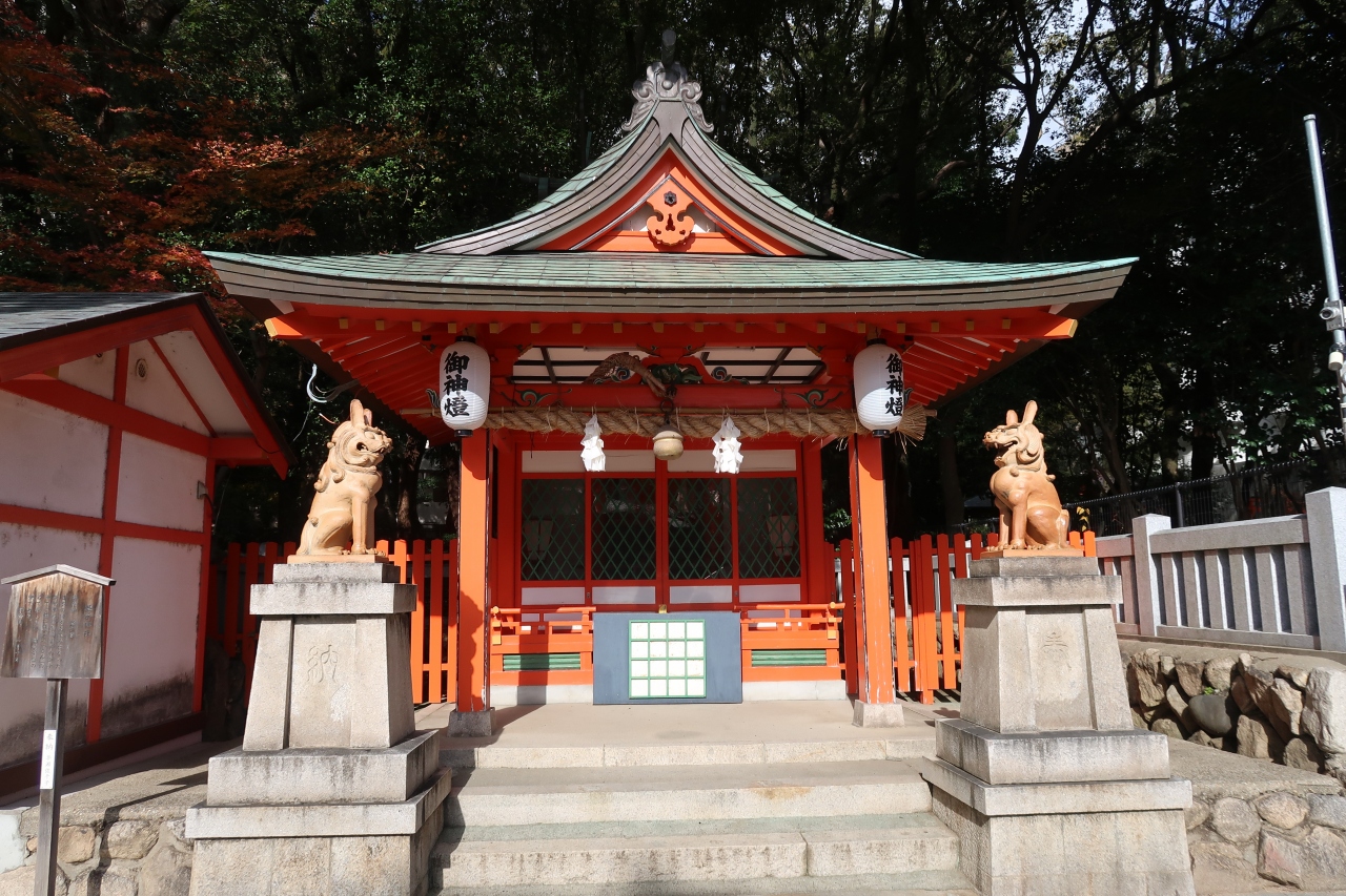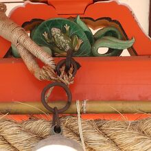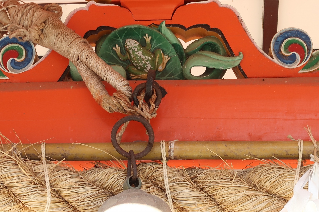 えべっさんの名で親しまれ、商売繁盛の神様。屋根を支える部材の一つでシルエットが蛙の股のように見えることから「蟇股(かえるまた)」と呼ばれるそうですが、そこにこれまた蛙の彫刻が施されていました。さらに左の狛犬には両耳の間に角があり、神社正面から撮影したところ、耳に角の影が映っていました。
