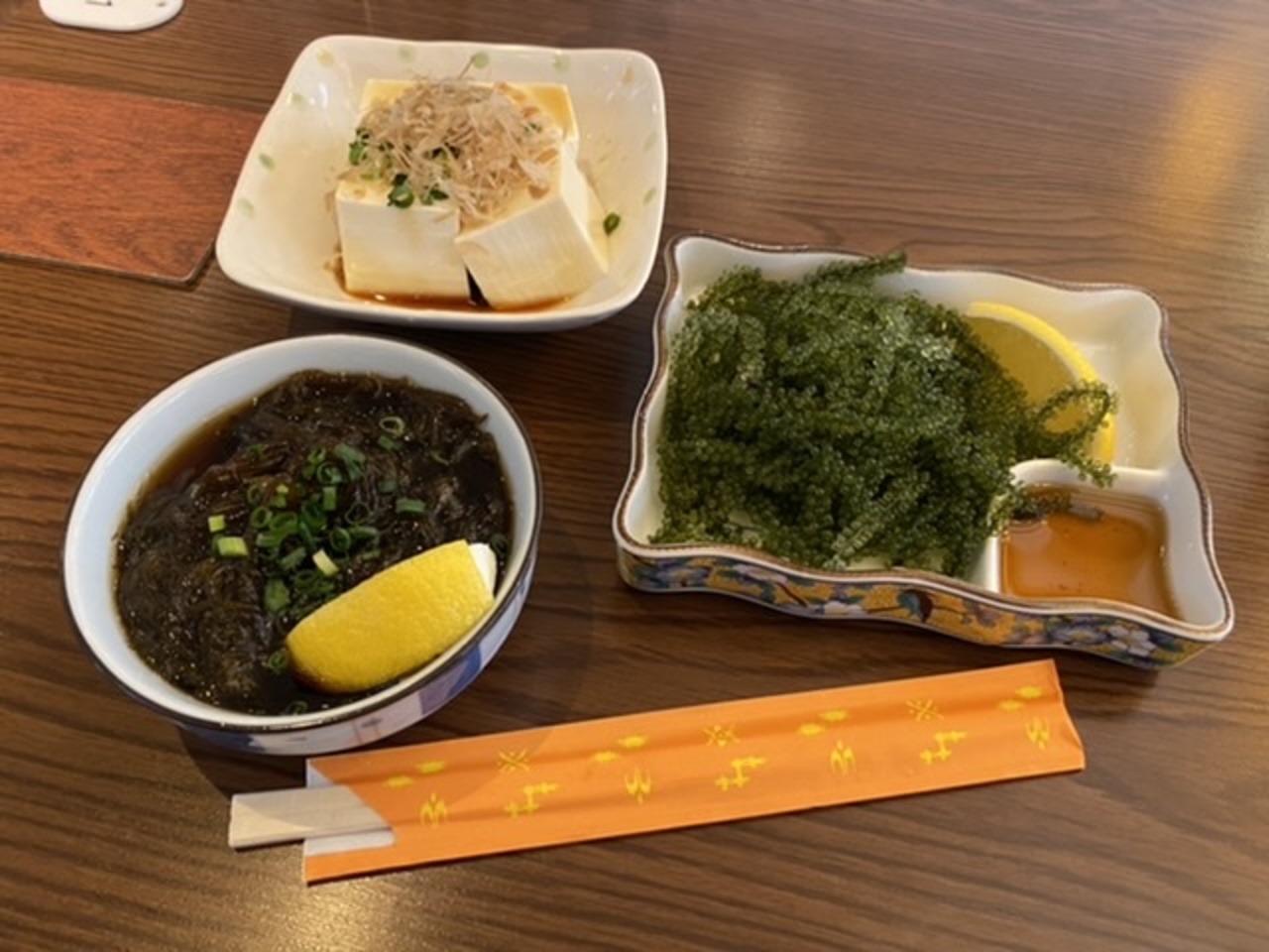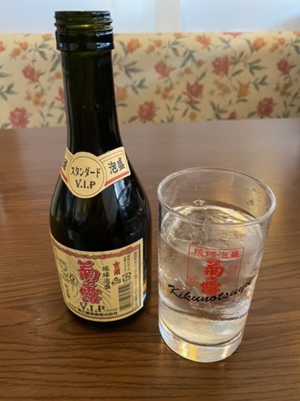 つまみはもずく酢、海ぶどう、冷奴をたのみました。泡盛は古酒ミニボトル1,650円!ロックで飲み干しましたよ。