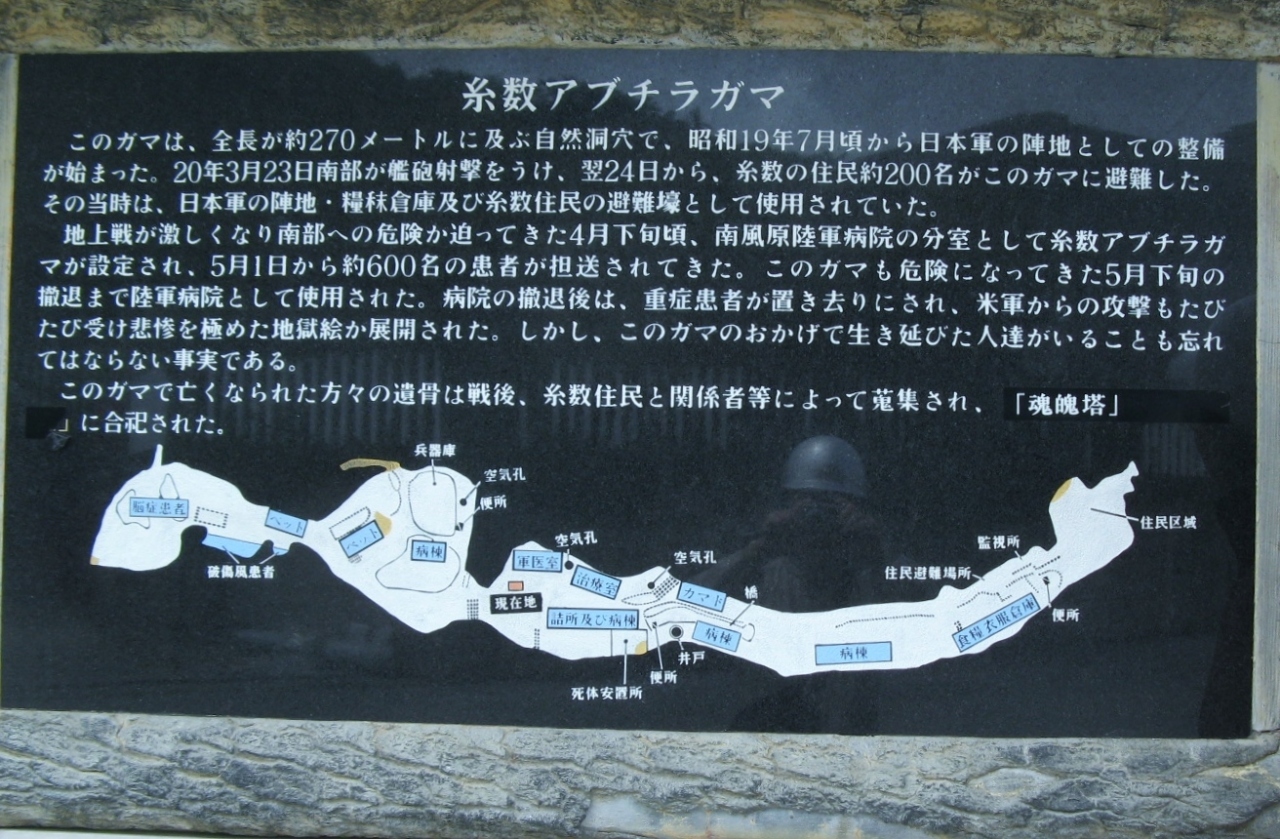 沖縄戦時、退避壕や日本軍の陣地や倉庫、陸軍病院の分室となっていたアブチラガマ。内部は思いのほか広く、現地にあった説明板によると全長270mもあるそうで、病棟や治療室、ベット、倉庫などと表示された開けた場所があり、手摺りも整備されていましたが足場の悪い狭い所もありました。戦禍の悲惨なことがあった場所を観ていると悲しい気持ちになりました。壕内は撮影禁止です。