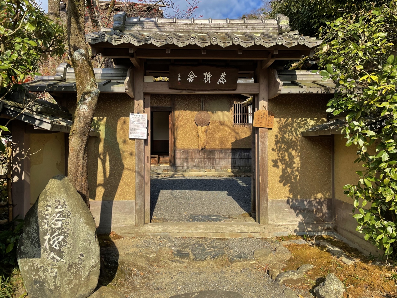 嵯峨野を散策中に通りました。松尾芭蕉の弟子・向井去来が別荘として使用していた草庵跡で、松尾芭蕉も3度訪れているとのことです。庭の柿の実が台風で一夜のうちに殆ど落ち尽くしてしまったことが名前の由来です。趣ある茅葺屋根が、嵯峨野の田園風景に調和しています。