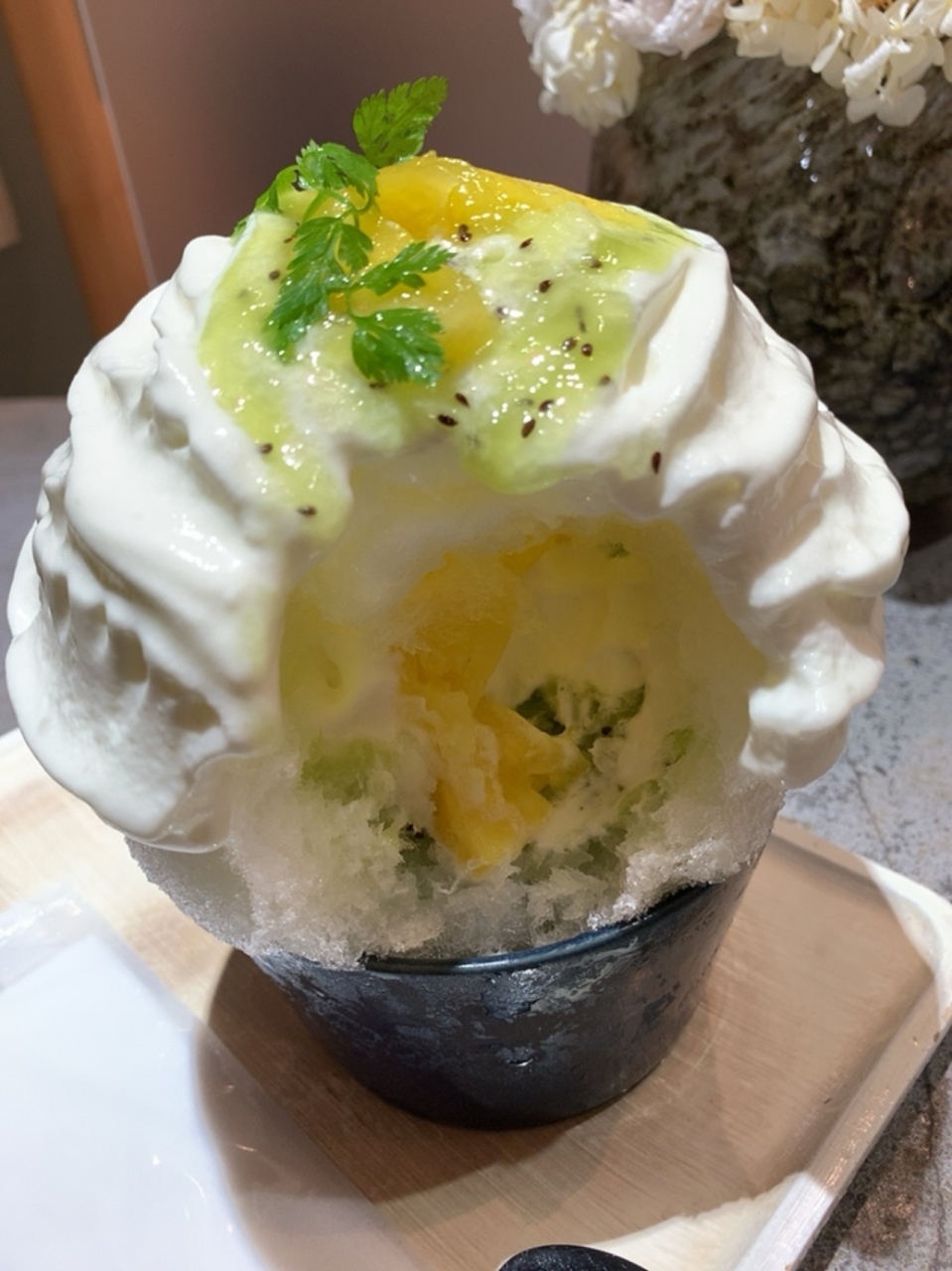 本当は、イチゴ系のかき氷が良かったんですけど、その日は既になくて、消去法でパインキウイヨーグルトを注文しました。 パイナップルとキウイソースが入ってて、外側はヨーグルトエスプーマで覆われています。 見た目、かき氷に見えないのがオシャレだわー。 食べててもかき氷が溶けてこない、エスプーマ、やっぱり凄いと思いました!