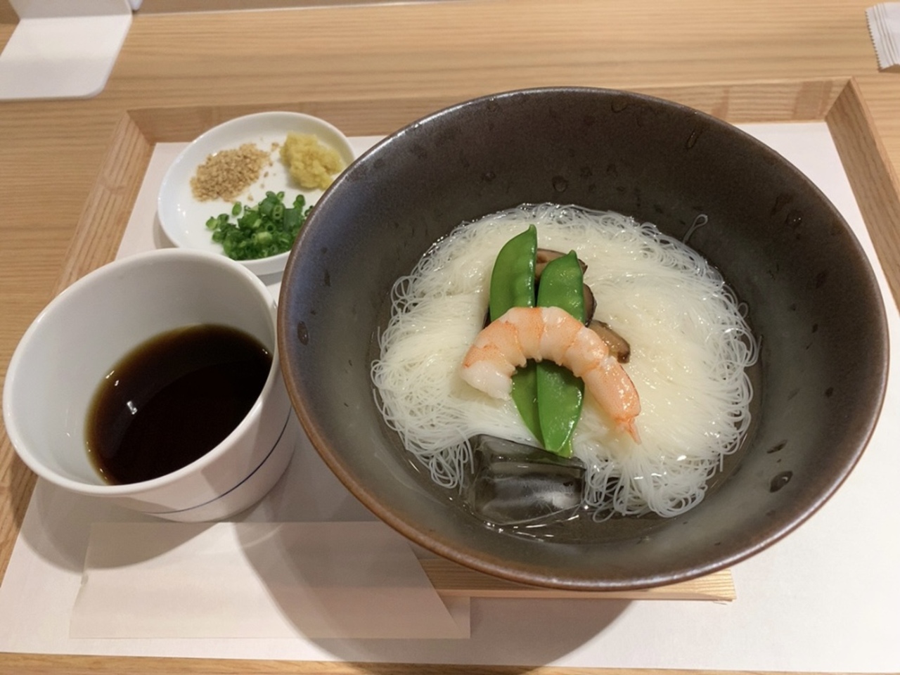 せっかくお店でおそうめんを食べるわけだから、普段、家でちゃちゃっと作って食べられないメニューを食べたい!って思ったので、冷やしそうめん「白髪」を注文。