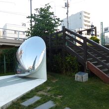 スカイツリーの西端から、東武橋を渡ったところに、大横川親水公園があります。南北に長い公園ですが、スカイツリーに近い北側の部分に、船の形の遊び場や、南の方へ行くと、じゃぶじゃぶ池があり、平日午後に行ったときは、放課後の子供たちで賑わっていました。北側の地区に、大きな凸面鏡がおかれていて、スカイツリーの全景が映し出されています。面白い写真が撮れます。