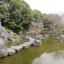昭和57年に足立区区政50年を記念して造られた、池泉回遊式日本庭園です。庭園全体、大名屋敷の庭園のような造りになっていて、庭園は白壁や木造の門、石垣に囲まれ、庭園内には大きな雪見灯籠や四阿、岩から流れ落ちる滝、雪吊りなどが配置されています。池を囲むようにして造られている遊歩道は、木々の手入れが行き届いていて、気持ちよく散歩することができました。庭園隣に造られた花畑公園には芝生広場や児童遊具、健康器具などが設置され、公園を囲むようにして100本ほどの幹が太く枝が広がった桜が植えられています。桜の季節には庭園と公園をのんびり散策することをおすすめします。