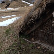 富山市にある北代遺跡は国指定史跡です。縄文時代中期の約4,000年前の集落遺跡が「北代縄文館」の奥の方に広がっています。土ぶき屋根で復元した竪穴住居5棟や、堀立柱建物1棟などの集落が復元されています。復元した建造物の中に入り込むことができました。