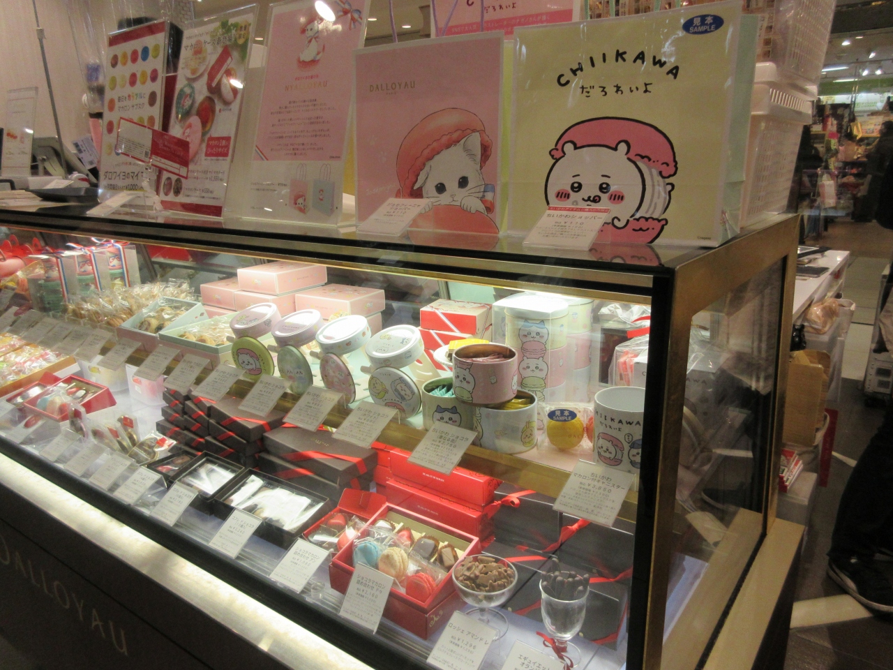 JR赤羽駅構内にあるエキュート赤羽にあります。バレンタインデー間近の休日午前に、スイーツを探しに寄りました。キャラクターパッケージを女性客が熱心に見ていました。チョコレート、マカロン、クッキーなどの焼き菓子がありました。白い子猫のイラストとキャラクターちいかわの包装が特徴です。チョコレートとマカロンの詰め合わせが4種類のキャラクター缶に入っている物が可愛く人気のようでした。有料手提げ袋は2種類で、子猫とキャラクターがありました。猫好きの人にぴったりのプレゼントになります。