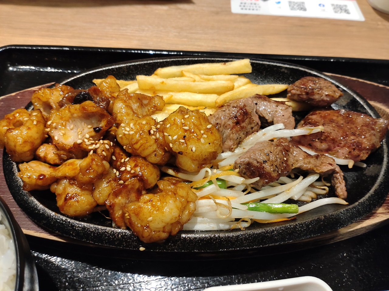 今回は「ホルモンミックス&ミスジステーキ定食」に300円プラスでホルモンミックス増量。待つこと5分くらい、提供されたホルモンは、福岡で食べた味がかなり再現しており、ホルモンはカリッとしていて中はじんわり柔らかい。ミスジは柔らかく適度にサシが入っていて美味。ただ、時間が経つと、冷めてしまうのは致し方がないとはいえ、フードコート店の限界かも。また、何故かフライドポテトが入っている。これは福岡のお店では出されないものです、やや違和感あり。やはりフードコートよりも鉄板で食べるお店が良いですね。