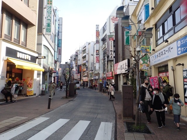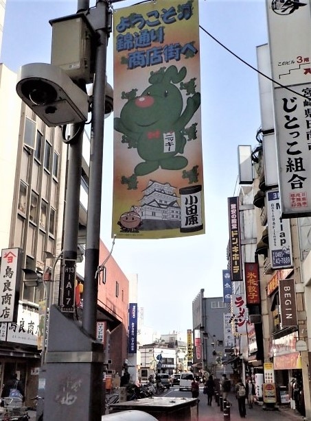 東海道線の小田原駅の駅前歩道橋を越えるあたりから始まる商店街。土地柄らしく、古い造りの店構えをしたそば屋があったり、コンビニや銀行の支店があったり、複眼的な商店街だ。商店街のマスコットキャラクター「ニッキー」のユーモラスな旗もあった。