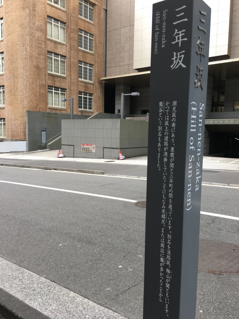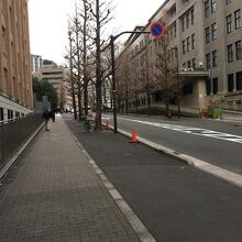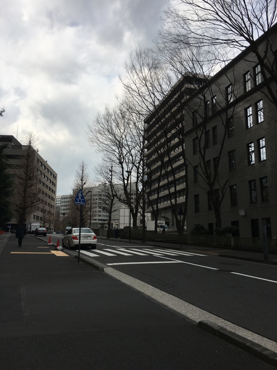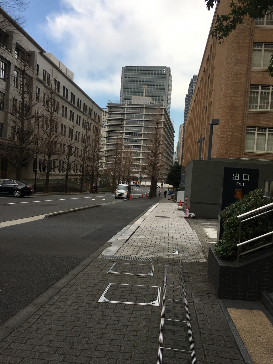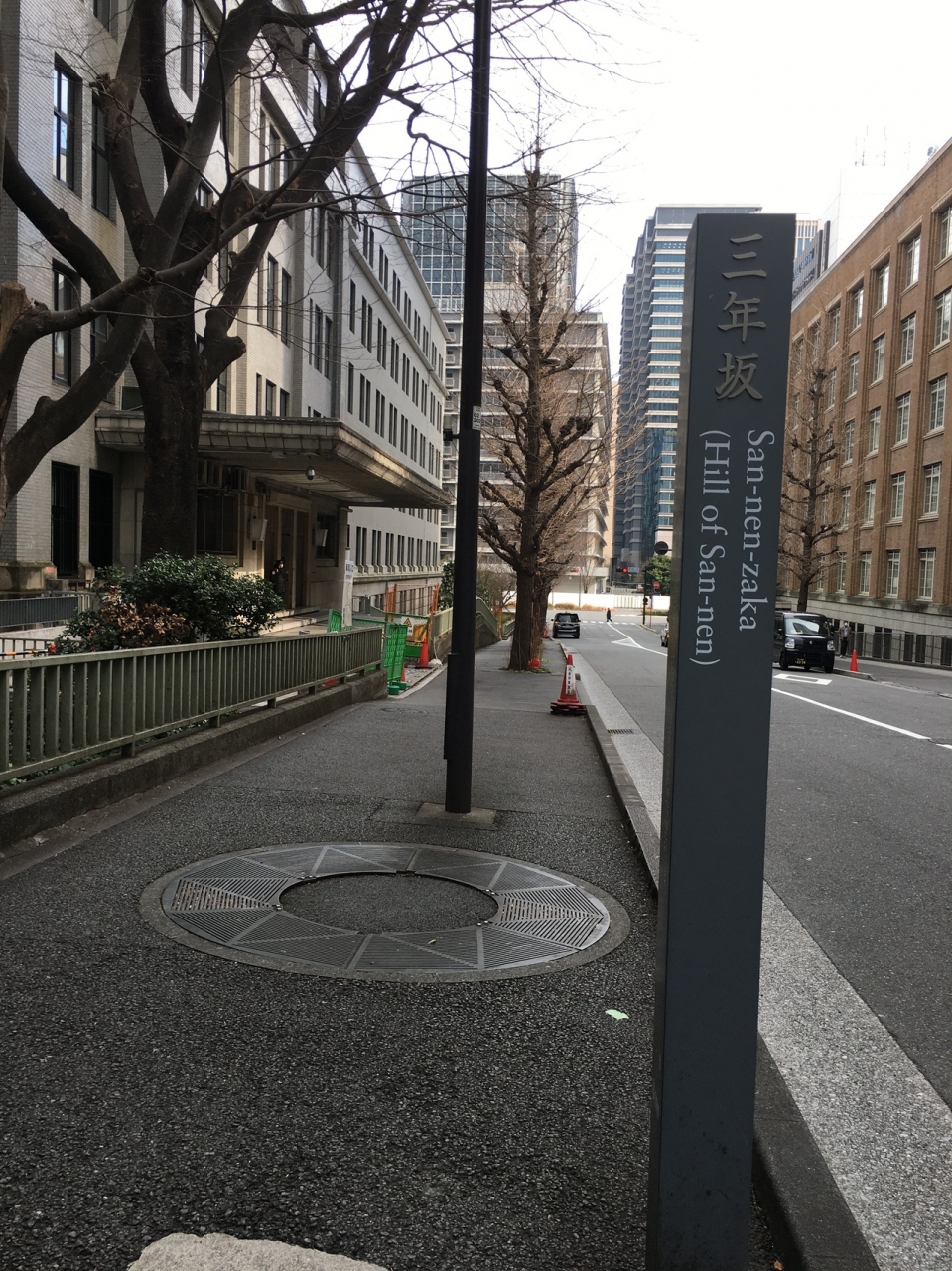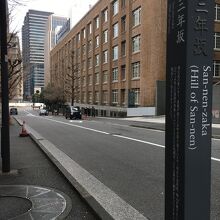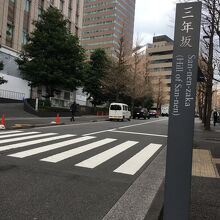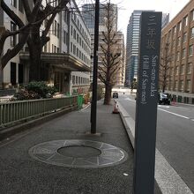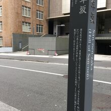 会計検査院や文部省のビルに挟まれた坂道で、車道と歩道の間には木があり、交通量は少なめでしたが、昼時や出退勤時間は人が多くなります。坂の名前は別名がいくつかあるらしく、杭のようなものに坂の名前が刻まれていました。