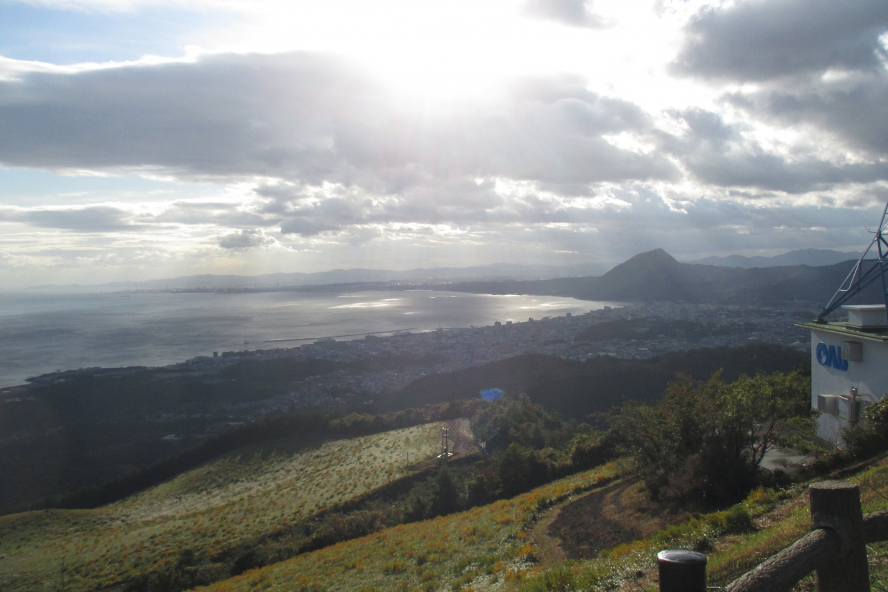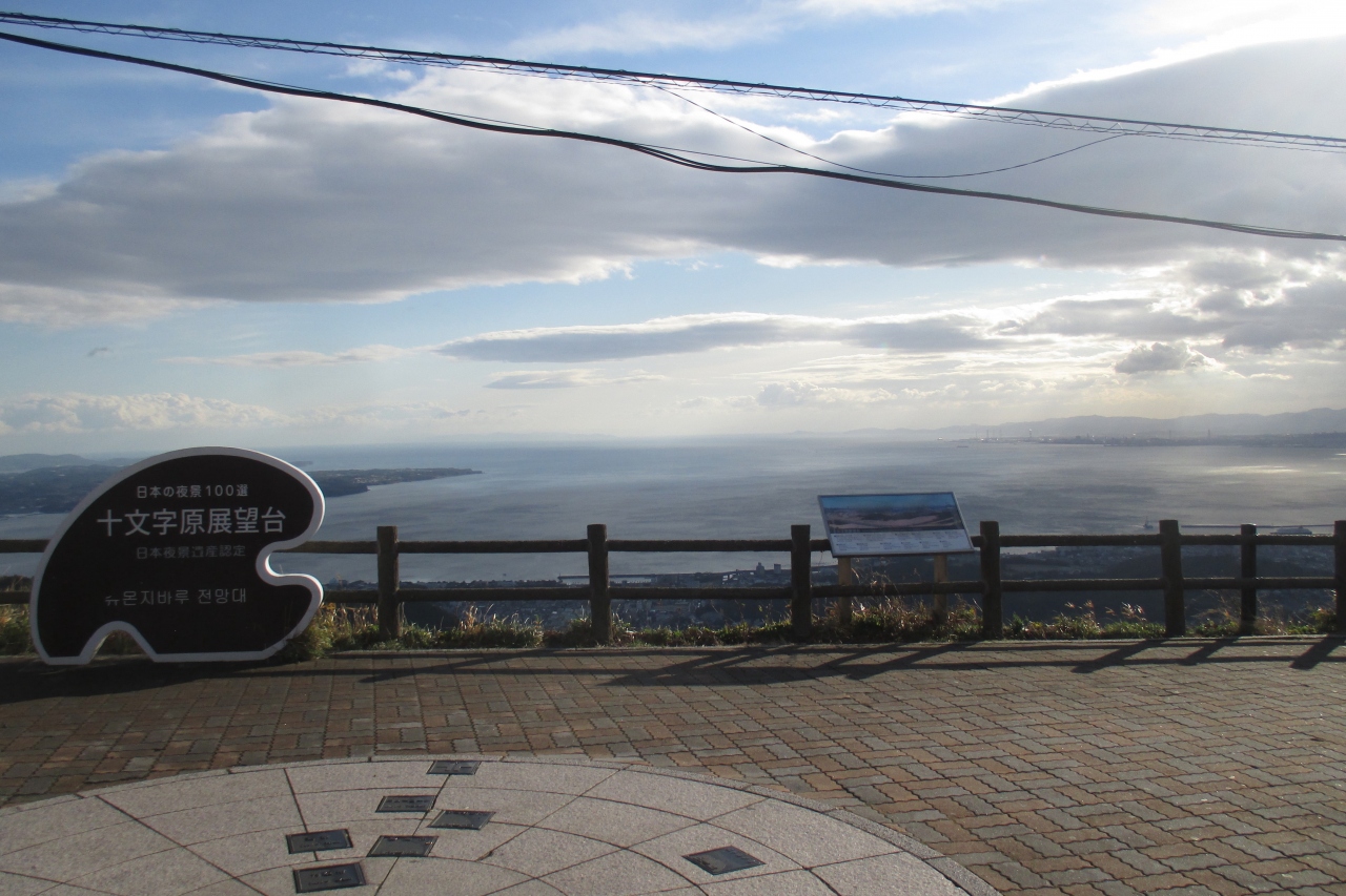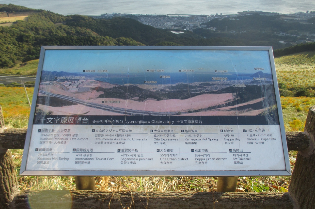 十文字原展望台は、明礬温泉から3kmくらい上ったところでした。横にはテレビ塔がいくつもありました。車を出ると強風が吹き付けてきました。海抜は500mほどあるので、別府湾を見下ろすかたちとなります。右手を見ると、別府市街地から高崎山、大分市方面の風景が拡がり、左手は日出、国東半島と一望でした。見通しが今一でしたが、目を凝らすと四国が霞んで見えました。