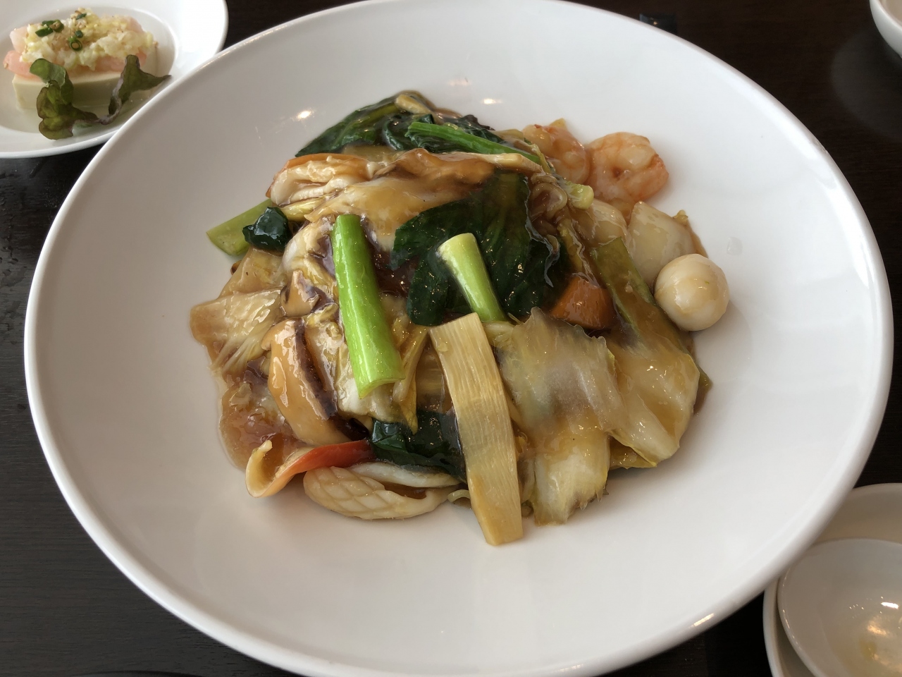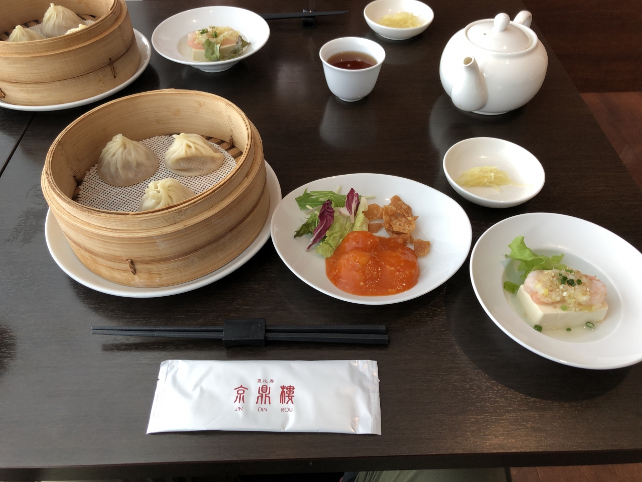 博多駅近くまで出かけるので、以前から訪れてみたかった京鼎樓をランチで予約しました。事前に予約を入れていましたので、窓際の景色の良い席を用意していただいていました。壁面は全面ガラス張りなので、福岡の市街地がよく見え非常に開放感があります。席に着いてメニューを確認し、「五目焼きそば」と「海老炒飯:を注文しました。海老炒飯は店員さんの勧めに従って、エビチリ付きのものにしました。初めに豆腐の上に海老を乗せた前菜と玉子スープ(海老炒飯のみに付いています)が出されました。しばらくして小籠包(3ケずつ)の入った蒸篭が出てきました。さっそく卓上の黒酢を付けて、刻んだ生姜を乗せていただきます。小籠包は小さめで、生ぬるい感じです。また肉汁もそれほど多くなく、自分の小籠包に対して持つ「火傷しそうな熱い肉汁が飛び出してくる」イメージの小籠包とは違って残念でした。スープは熱くて美味しくいただけました。エビチリはちょっとスパイシーすぎる感があります。エビはジューシーさが残り美味しいです。メインの海老炒飯はパラッとした仕上がりで油濃さがなく食べやすいし美味しいです。妻の注文した五目焼きそばは先に軽い焦げ目をつけた麺に五目餡をかけた感じで美味しくいただけました。京鼎樓といえば、やはり小籠包に期待しますのでやや厳しい目の評価にしました。