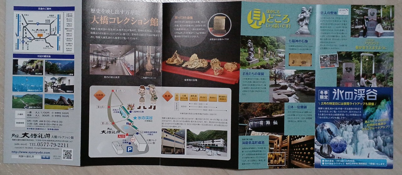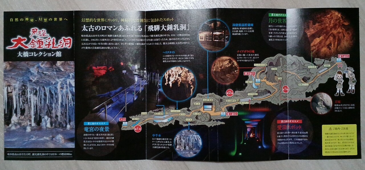 約2年半ぶり3回目。鍾乳洞を訪れる際は懐中電灯(LEDライト)を持参している。飛騨大鍾乳洞も暗い天井や奥の方はライトを照らすとよく見えた。第2出口を過ぎた大石柱はアップダウンでぐるっとまわるルート。第3出口から駐車場への下り階段の左手に3箇所に分かれて氷の渓谷(人工氷柱)あり。ライトアップは岐阜県のまん延防止等重点措置の為、中止だった。入場料はJAFカードの提示で1名100円引き、HPにも100円引き券が載っているので提示でもう1名100円引きになった。