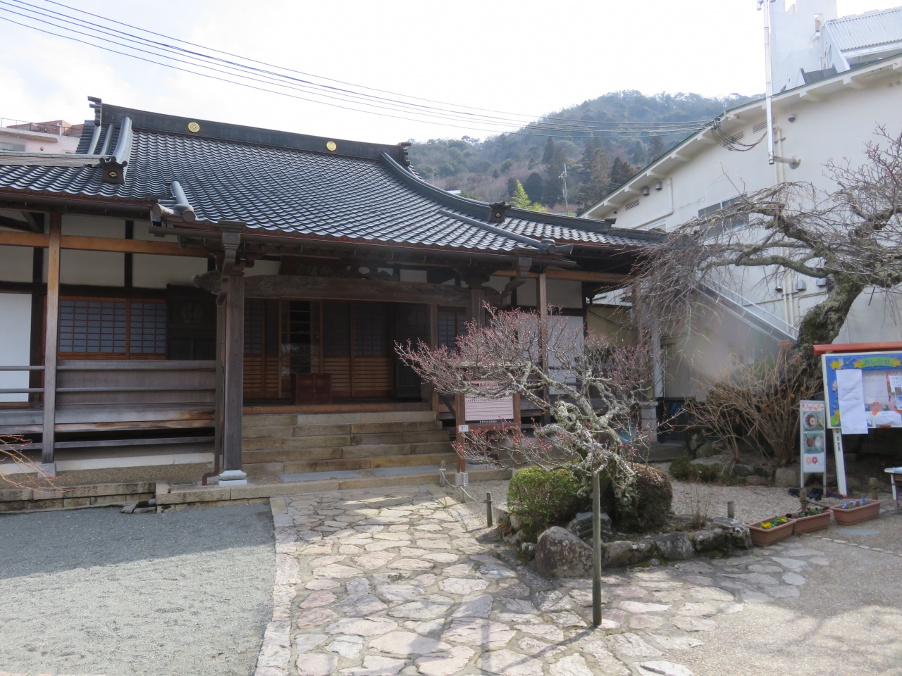 有馬温泉は温泉街から離れたところにある浄土真宗のお寺です。坂の上にさらに階段があるので厳しいですがお参りしました。境内には梅の古木があり、もうしばらくすると美しい花を咲かせるでしょう。まだ硬いつぼみはその想像をかきたてるのに充分なものでした。