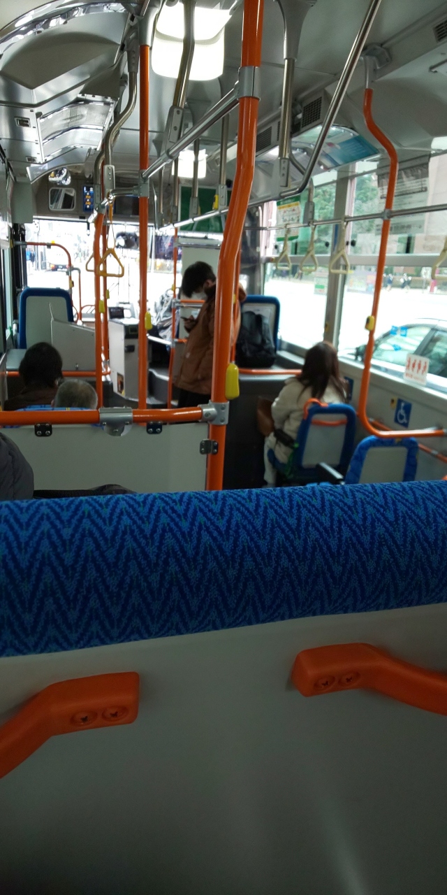 とても車内はすいていて、ラッシュ時間帯以外は空席も多いです。青いシートと、オレンジの手すりやつり革がデザインされた車内となっていて、明るい印象です。