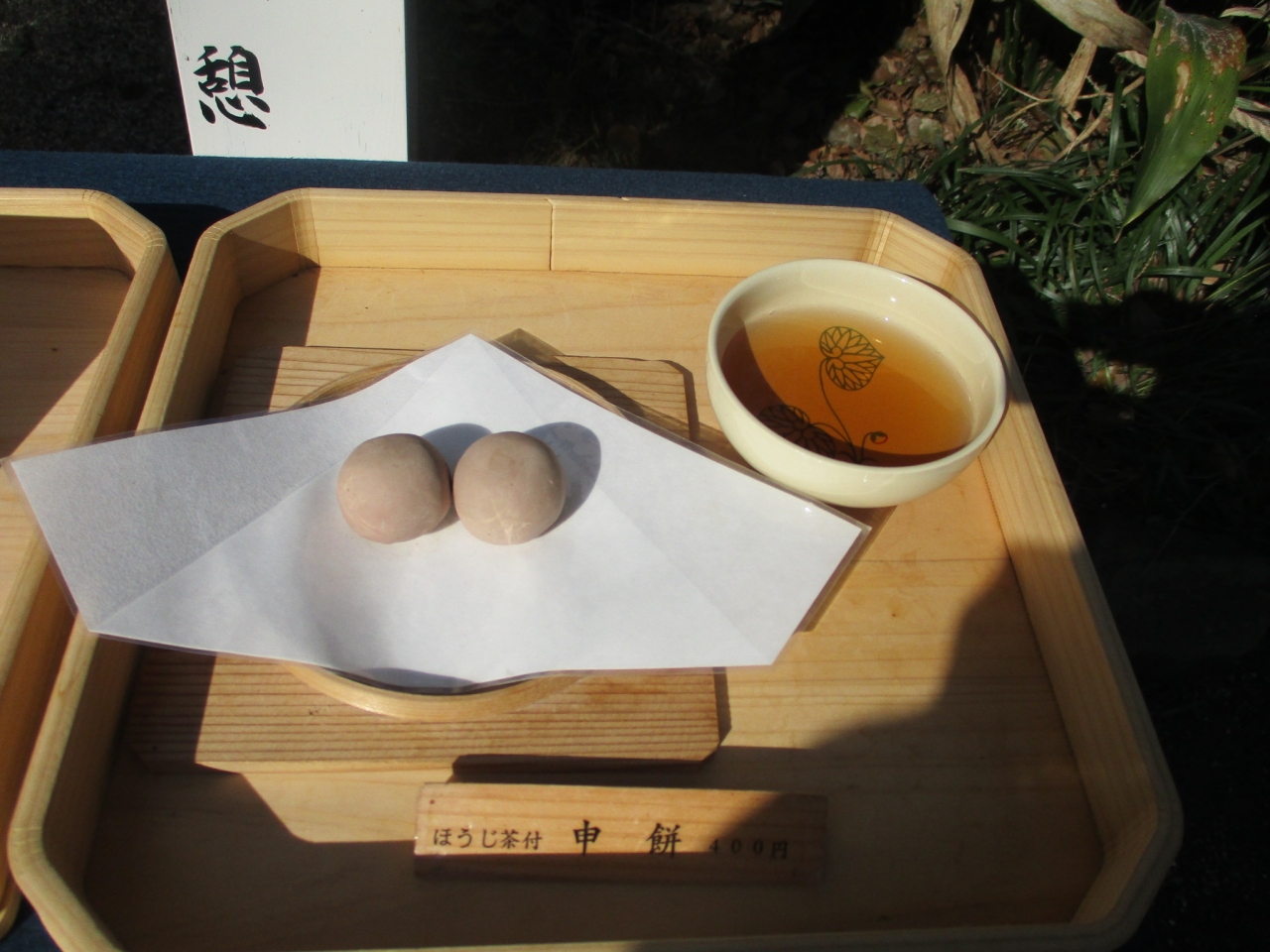 下鴨神社の参道、糺の森にあるお休み処です。こちらの申餅が名物です。小豆のゆで汁でついたお餅の中に小豆が入っています。もとは葵祭期間中に食べられていたというお餅です。豆茶とセットなどがあります。木のお盆で出てきて風流です。
