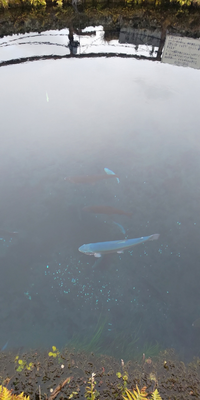 澄んだ水がとてもきれいな池で、魚もたくさん泳いでいます。池を覗き込むとかなり深いところまで見えて、いかにこの池の水がきれいかというのがわかります。