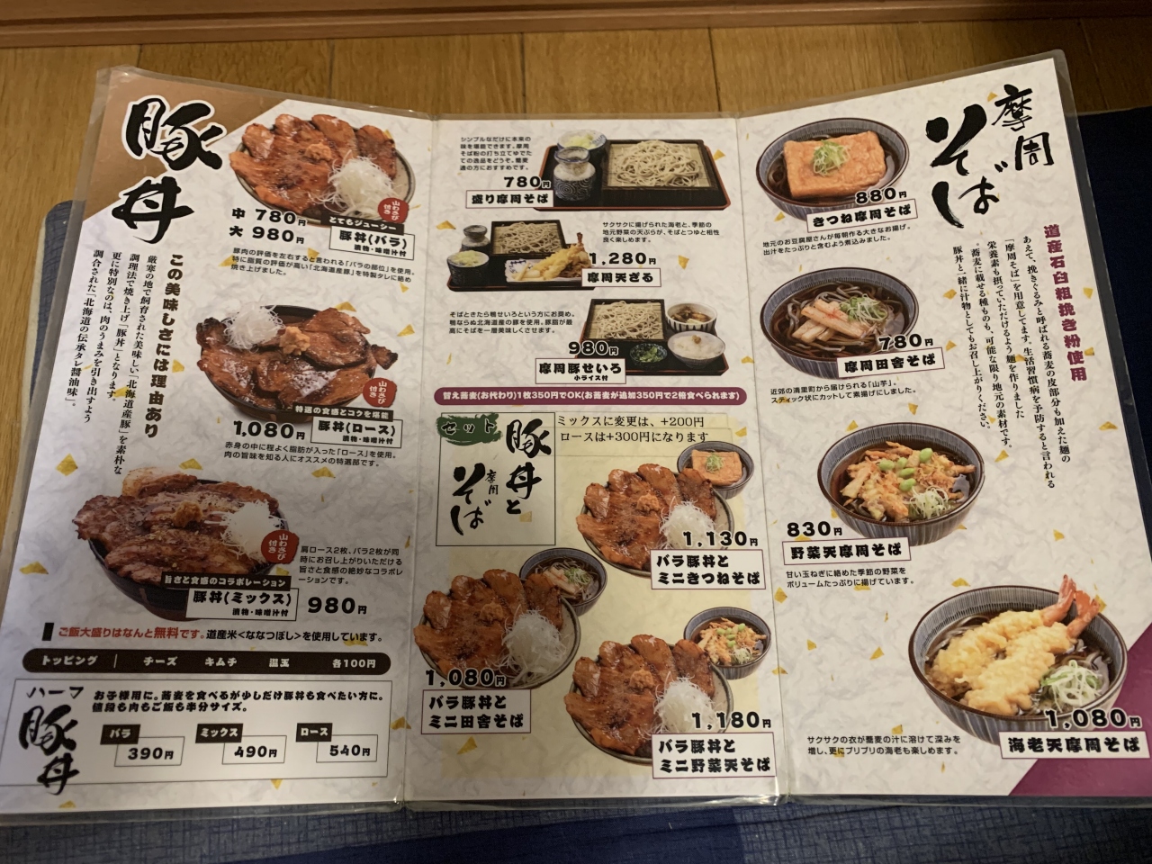 弟子屈市街をぐるっと迂回する国道391号沿いにある「豚丼」と「摩周そば」の店です。店内はカウンターとテーブル、小あがり。小あがりの席に案内いただきました。私は北海道産豚使用の「豚丼(ロース)」をオーダー。山わさびがのってます。帯広の”とん田”には及びませんがなかなかでした。妻は「盛り摩周そば」をオーダー。弟子屈で栽培したそばを早めに刈り取り天日干し、石臼粗挽き粉にし毎朝その日の分だけ手打ちするのだそうです。見た目ちょっと太めで歯ごたえがありました。駐車場も広く入りやすいお店です。街道沿いなのでドライブインとしておすすめ。