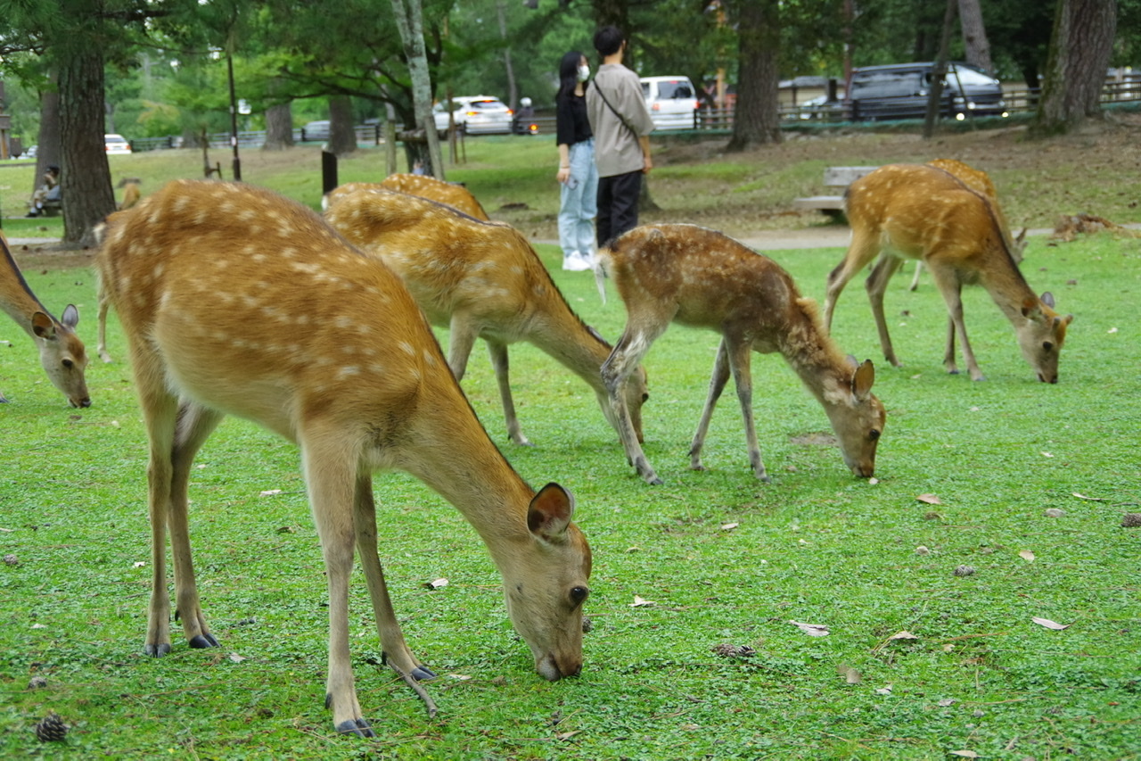 奈良公園は、奈良旅行と言ったらお約束の場所の1つだと思います。 野生の鹿が本当にたくさんいて、街中にも普通に出るので、慣れていない観光客には結構驚きだと思います。 車の運転をする場合、気を付ける必要がありますね。