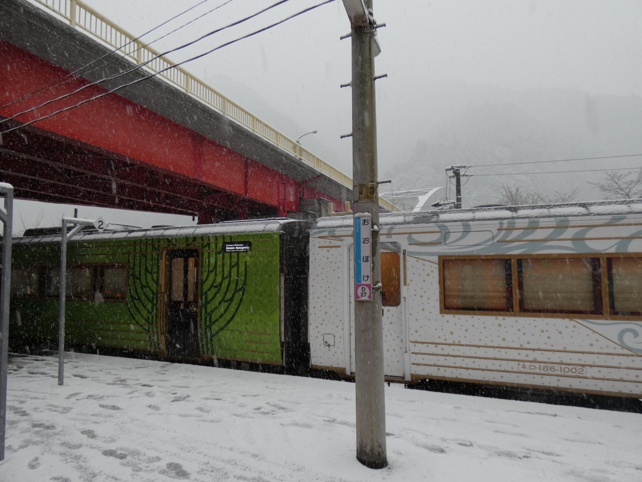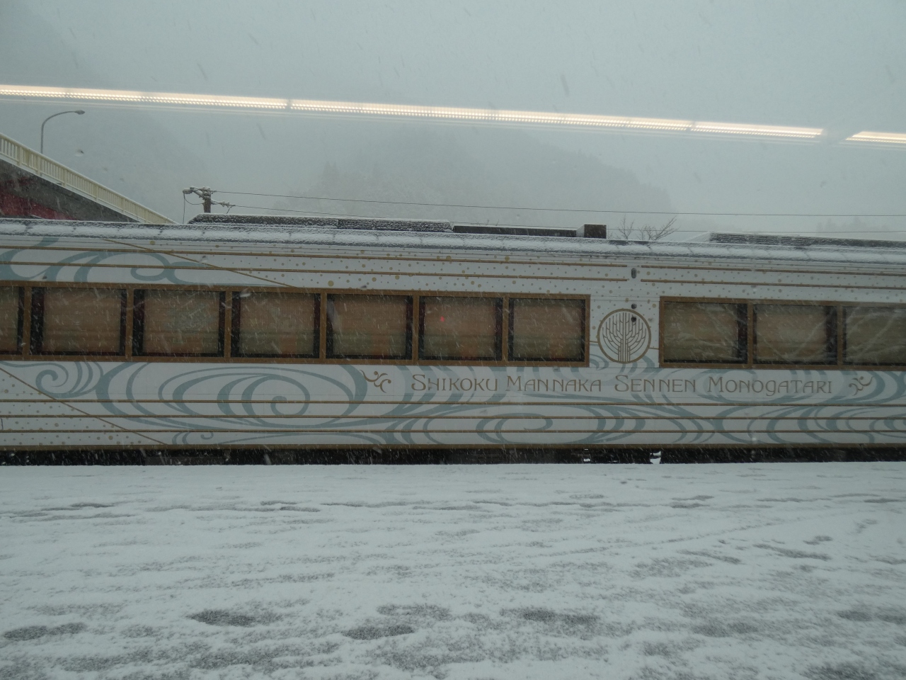香川県多度津~徳島県大歩危間の四国山地を横断して走る観光列車です。ちょうど高知から大歩危駅に着いた時に大雪で停車が長くなり、隣ホームに停車していました。こちらは南風アンパンマン列車、1日1往復の四国まんなか千年物語に出会えるとは幸運です。絶景を見ながら美味しいお弁当を食べて、羨ましい。