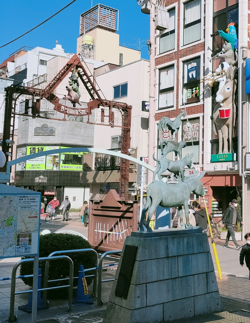ブレーメン通り商店街は元住吉駅から尻手黒川道路辺りまでです。商店街の上部にはブレーメンの音楽隊の動物などのオブジェがあり、なかなか賑やかな商店街ですが、尻手黒川道路に近づくと徐々に静かな道路になります。
