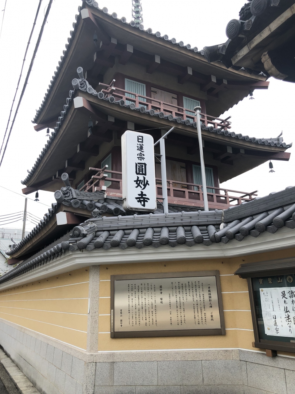 谷町筋から一本西の通りは寺院が多く集まっています。その中のひとつに円妙寺という日蓮宗のお寺があります。曹洞宗大倫寺のお隣です。古くは”水の寺”と呼ばれ、仁徳天皇(高津宮)の献茶水として使われていた古井戸からは今も清水が湧き出ているそうです。三重塔が印象的でした。