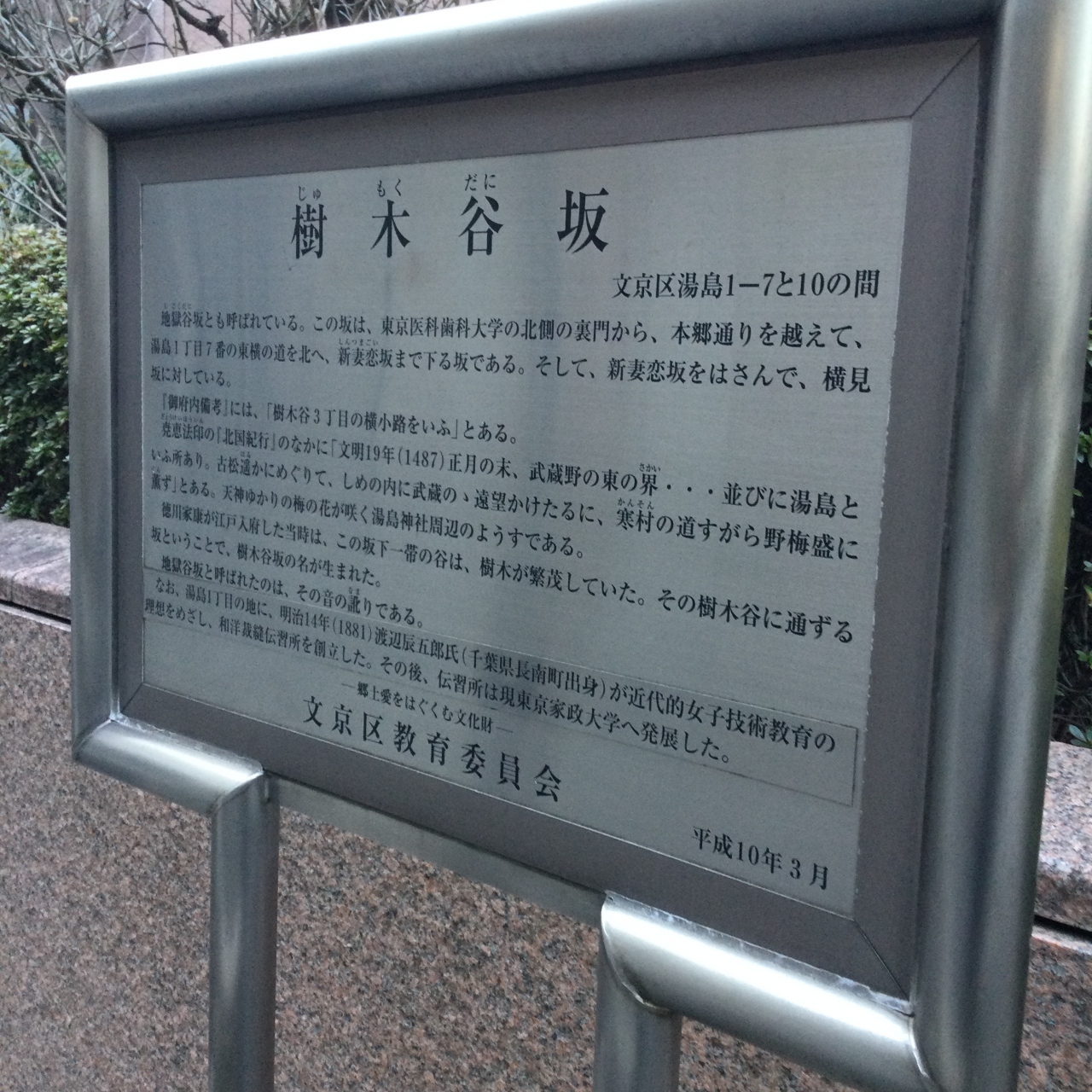 文京区湯島1丁目、本郷通りの東京医科歯科大学北門の前から、東京ガーデンパレスの東側を通って蔵前通りに抜ける坂道で、丁度おりがみ会館の横に出ます。説明板によると「地獄谷坂」とも呼ばれているとありますが、それは「樹木谷(じゅもくだに)」の音が訛ってと「じこくだに」という。いわれればそうとも思える(?)