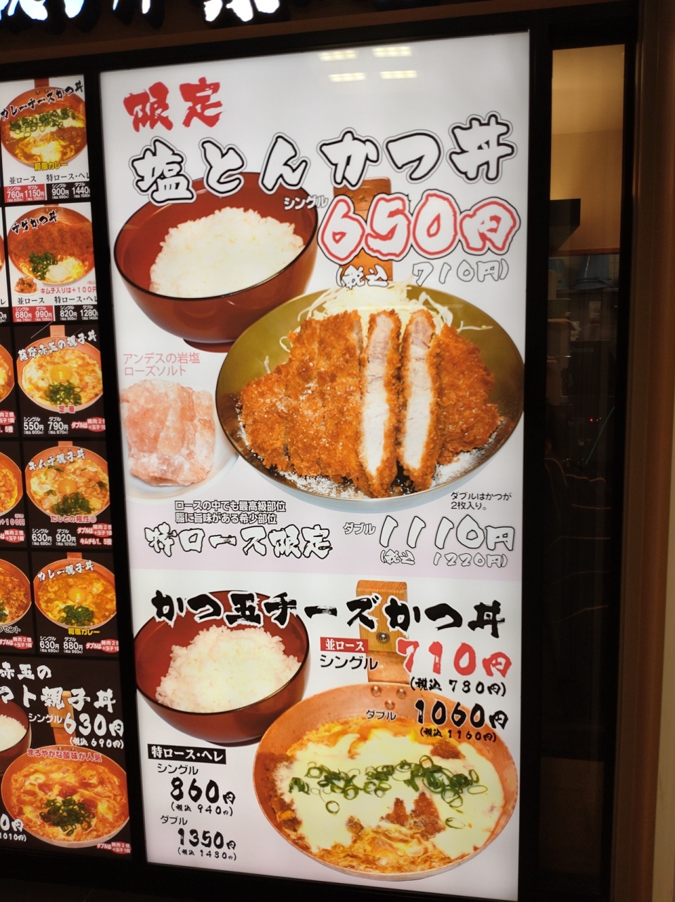 こちらの特徴は、「変わりかつ丼」のメニューの豊富さと、カツ丼ながらも綴じたカツ丼が別皿で提供されること。「変わりカツ丼」は、卵とじのいわゆるかつ丼から、ソースかつ丼、おろしかつ丼(こちらが発祥とのこと)などポピュラーなものから、トマトかつ丼、チーズかつ丼、塩とんかつ丼、キムチかつ丼をはじめ、期間限定メニューを除いても18種類もある。指定農場で、穀物飼料で育てられた原種豚の生ロース肉を使ったカツと、カツオやサバを使った手作りの天然だし、国産野菜、国産米、キャノーラ油、生パン粉を使ったカツは、あっさりヘルシーの「並ロース」と、旨味の多い「特ロース」がおり、特ロースはプラス150円。かつも1枚のシングルか2枚のダブルから選択。定食にするか空だや惣菜から2つ選べるセットから選べる。