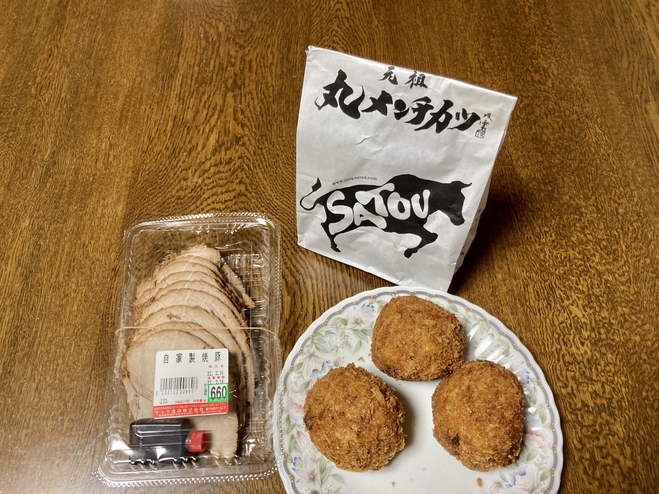 通りすがりに再購入したのはメンチカツ5個と焼豚。メンチカツは1個250円ですが、5個以上買うと単価が230円になります。見た目のガッツリ感とは違い、メンチカツはジューシーで意外にさっぱりしたお味です。上質の牛肉を使っているからに他なりません。焼豚はラーメンのトッピング用です。