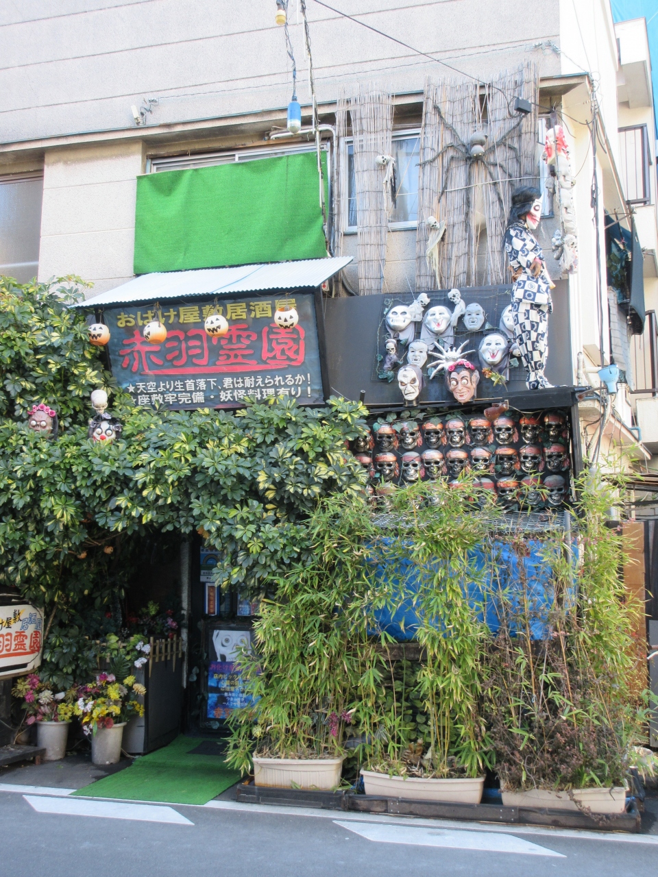 インパクトある店名に惹かれ訪れた、赤羽駅東口から10分ほどのところにある居酒屋です。センベロの聖地赤羽にあることから、昼もオープンしているかと思い訪れましたが、案の定、夕方からの営業でした。建物の外壁にはたくさんの骸骨が並び、屋根からは幽霊の人形が吊り下げられ、いかにも幽霊屋敷らしさが感じられました。あるサイトによると、店内にも骸骨や幽霊、お化けなどが多数飾られ、びっくりするようなからくりもあるようです。つまみも名称からは想像できない料理のようで、テーブルに運ばれてきて初めて料理の内容がわかる仕組みになっているとのことです。お酒とお化け屋敷が楽しめるようなので、ぜひ夕方に再訪しようと思います。