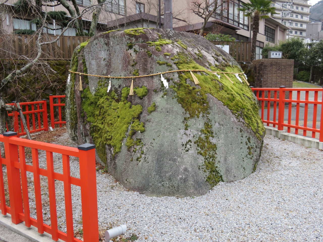 有馬温泉の道路わきに突如現れる石というより岩だ。美しい乙女を怪しんで矢を射るなんてありえない伝説は信じないが、こんな岩を袂に入れて投げつけるなんて、なんと恐ろしい女神伝説だと逆に感心してしまうくらいです。