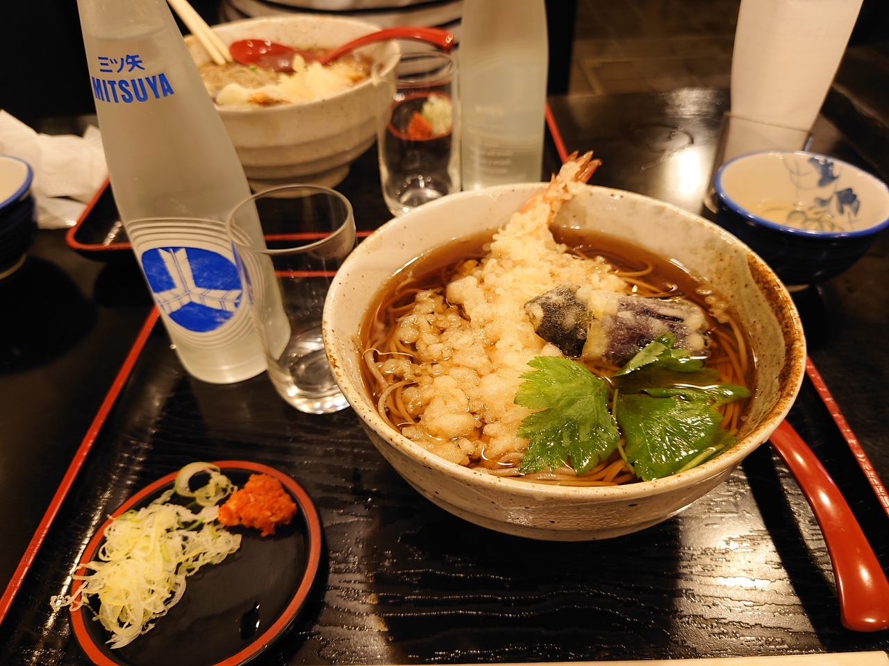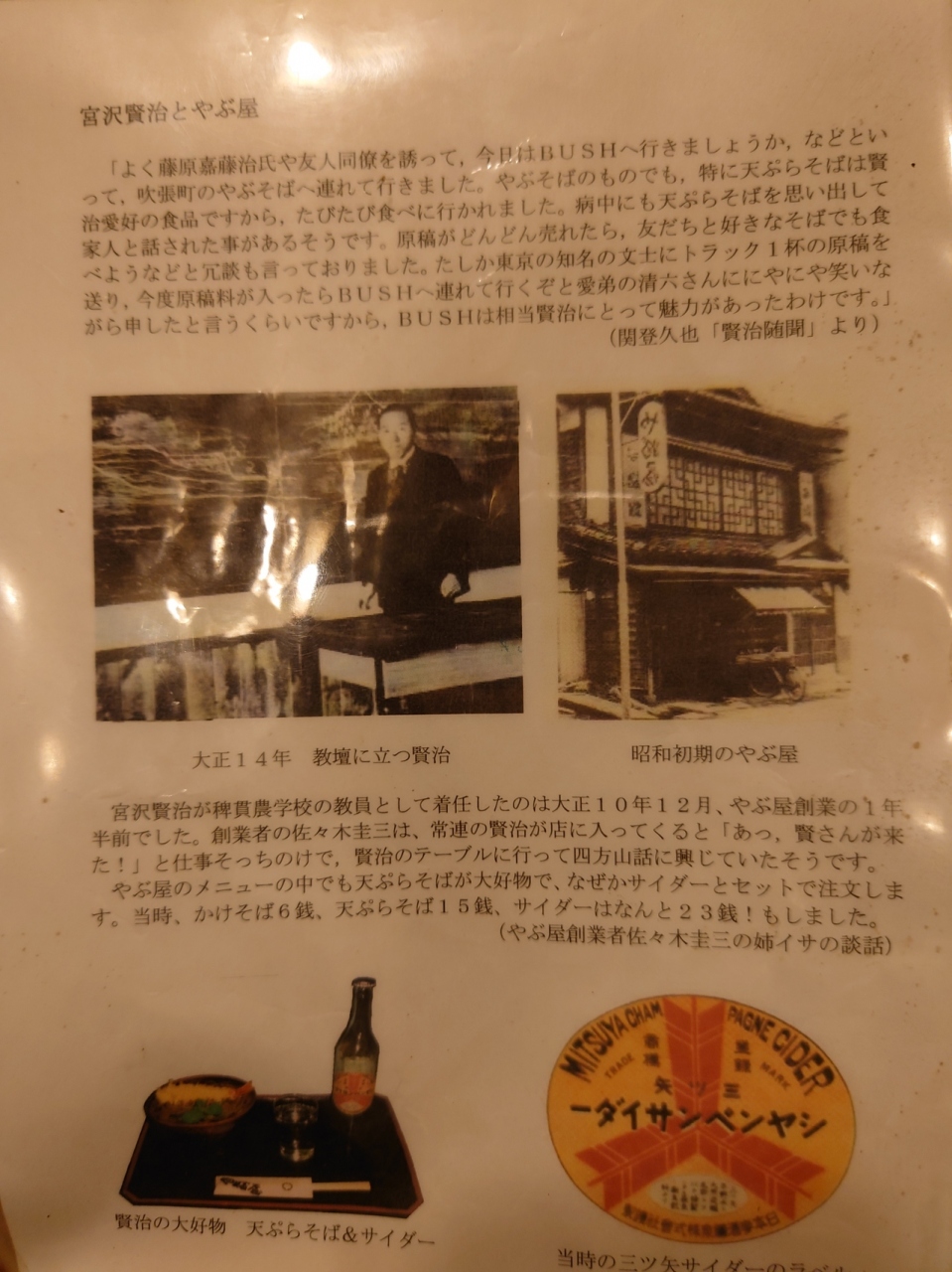 注目のメニューは、実際に賢治が好んで組み合わせていたという天ぷら蕎麦と三ツ矢サイダーの「宮沢賢治セット」。この組み合わせってどうなのよと思っていましたが、蕎麦で体を温めた後に一気に冷たいサイダーで喉を潤すのは実に後味さわやかで、非常に合うと思いました(笑)