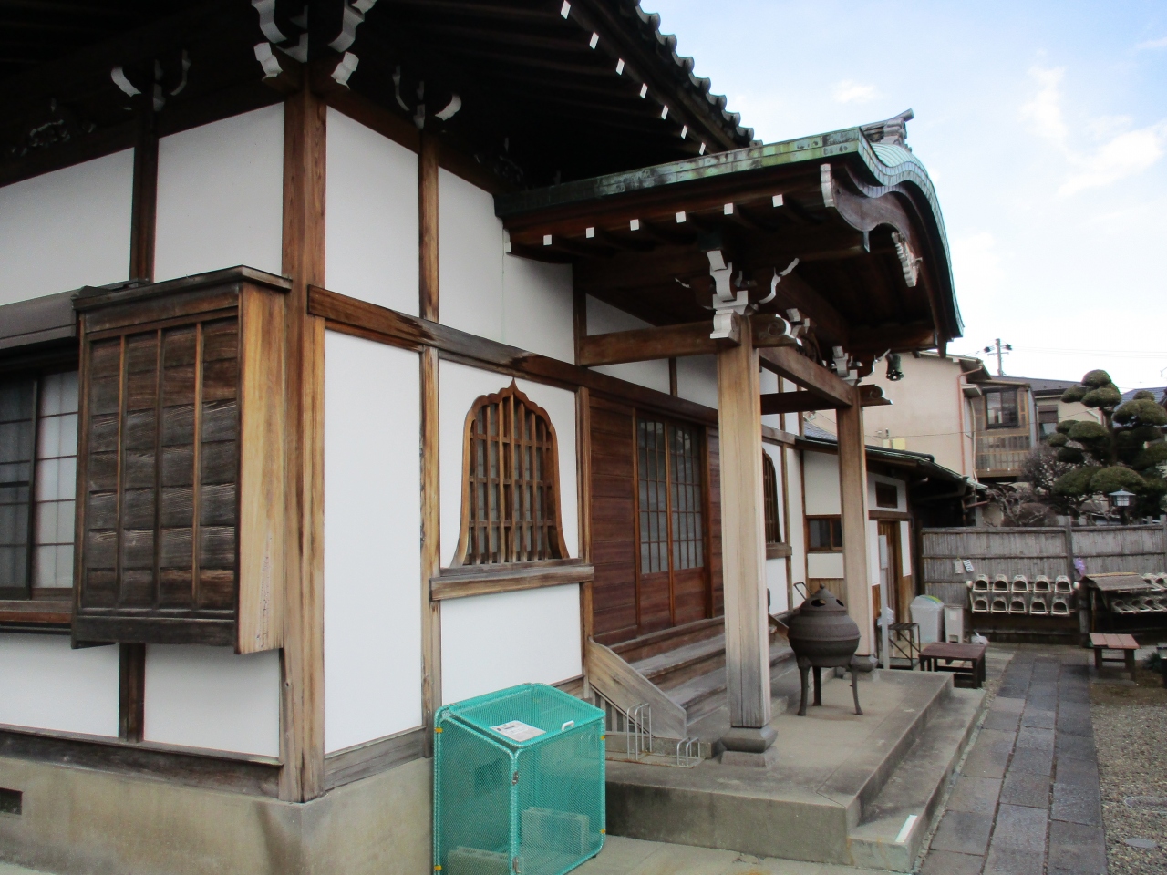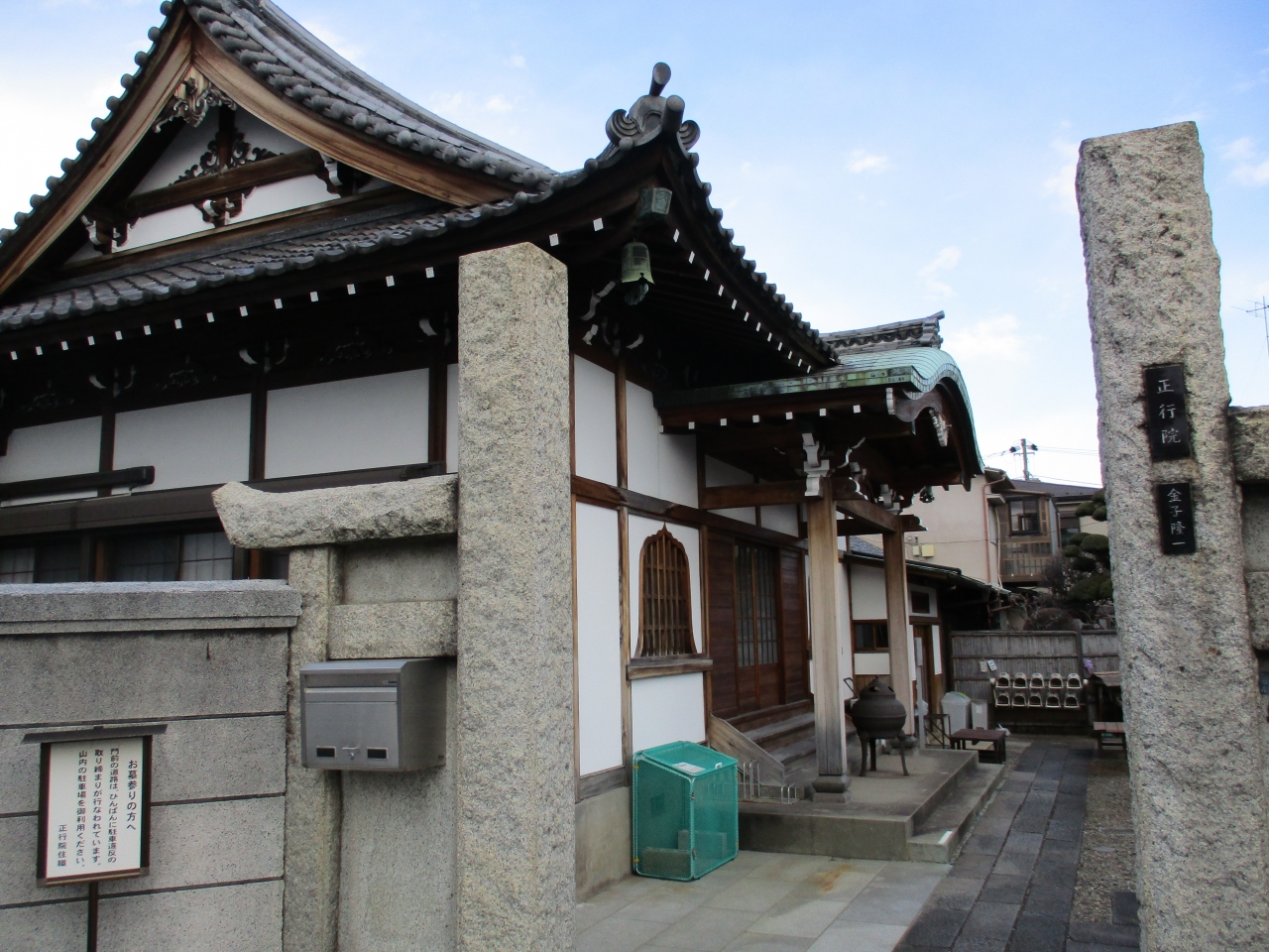 谷中にある日本美術院沿いにあるお寺です。門からすぐの場所に本堂がありますが、本堂の向きが横向きになっていて、あまり奥行きもないので、とても狭く感じる寺院でした。門前の道幅は広いようですが、駐車違反取り締まり注意の案内がありました。