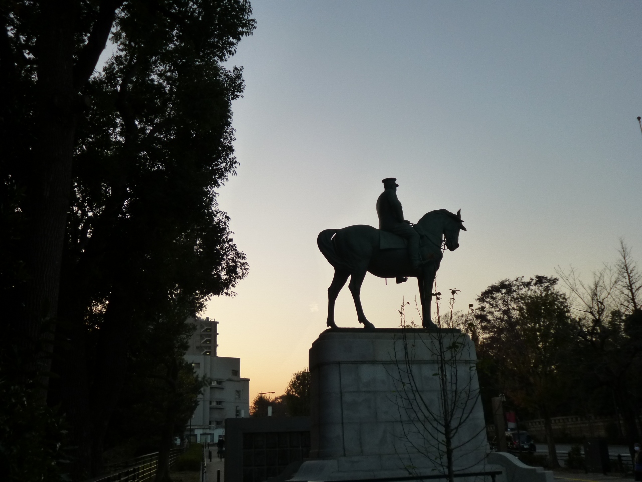 靖国通りの南側に隣接した「九段坂公園」は小さな公園ですが、銅像や高燈篭など見どころがたくさんあります。そのひとつが、初代の陸軍大臣を務めた大山巌の騎馬像です。台座も含めて大きく迫力のある像で、軍服をまとい馬にまたがる風格ある姿が印象的でした。
