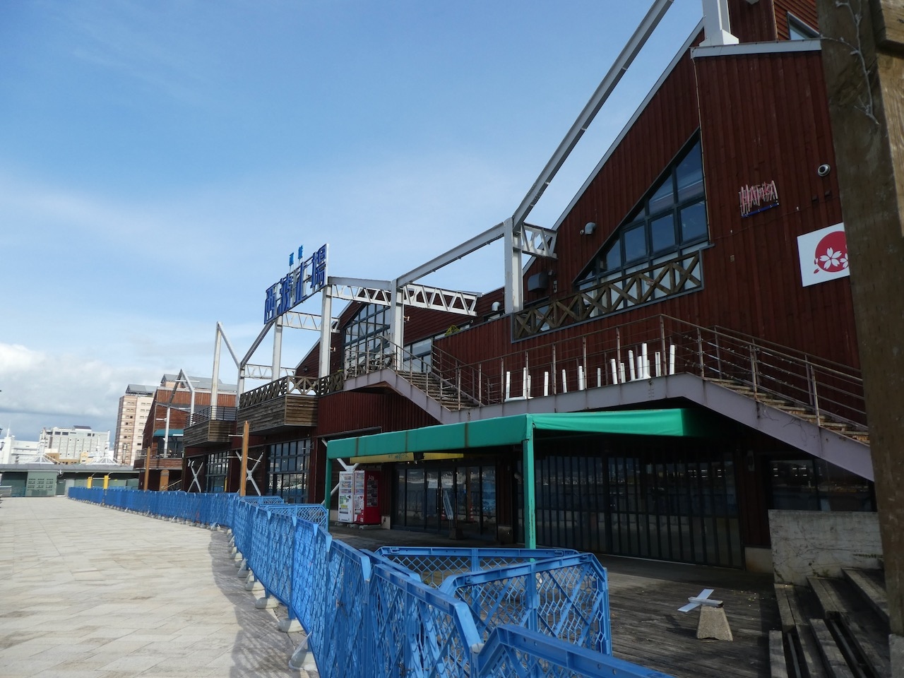 函館観光も金森倉庫の南側は海岸の方も観光で賑わうようになってきています。この大型ショッピングモールも天井の高い大きな建物で倉庫のような雰囲気で観光気分が出ます。ただ、海側はなぜか囲ってあって入れず、静かな雰囲気。まだ公園の整備中だからかもしれません。1階は土産物売り場がメインで、2階には食事どころがあり、昼は賑わうのかもしれません。