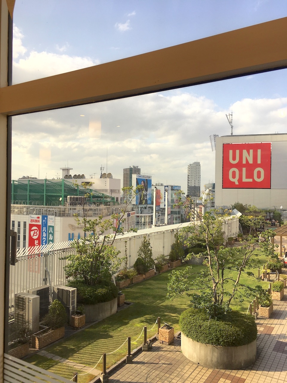10Fにある書店を利用し、店内を奥まで進むと、窓の外に9F南側の屋上広場が見えました。