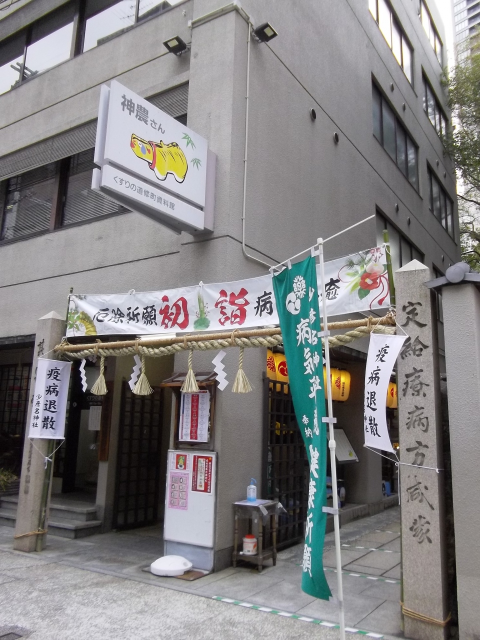 堺筋から道修町通りを入った直ぐのビルの谷間に隠れるように佇む「少彦名神社」は江戸時代から薬の町として栄えて来た道修町の守り神、薬祖神として少彦名命が祀れれている。