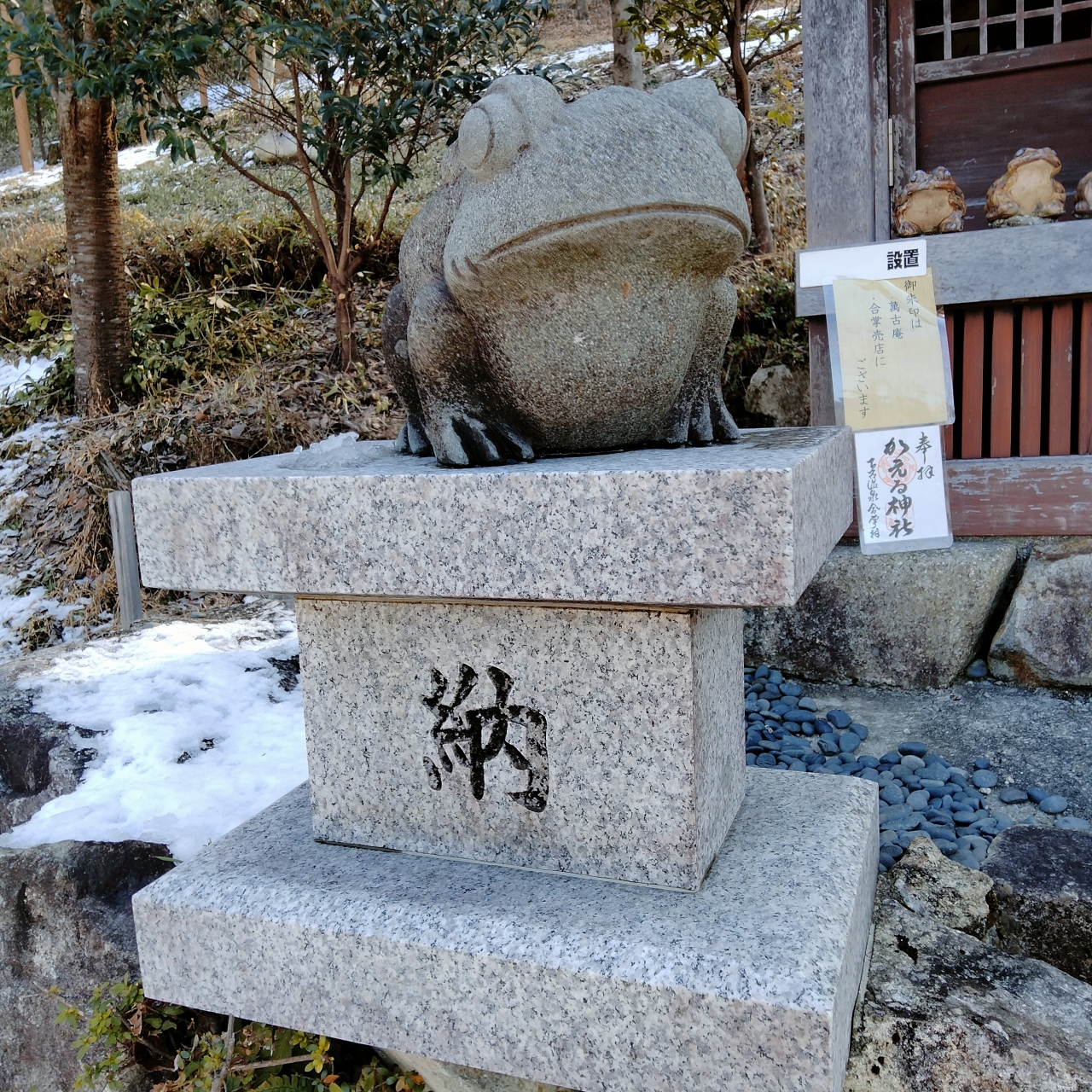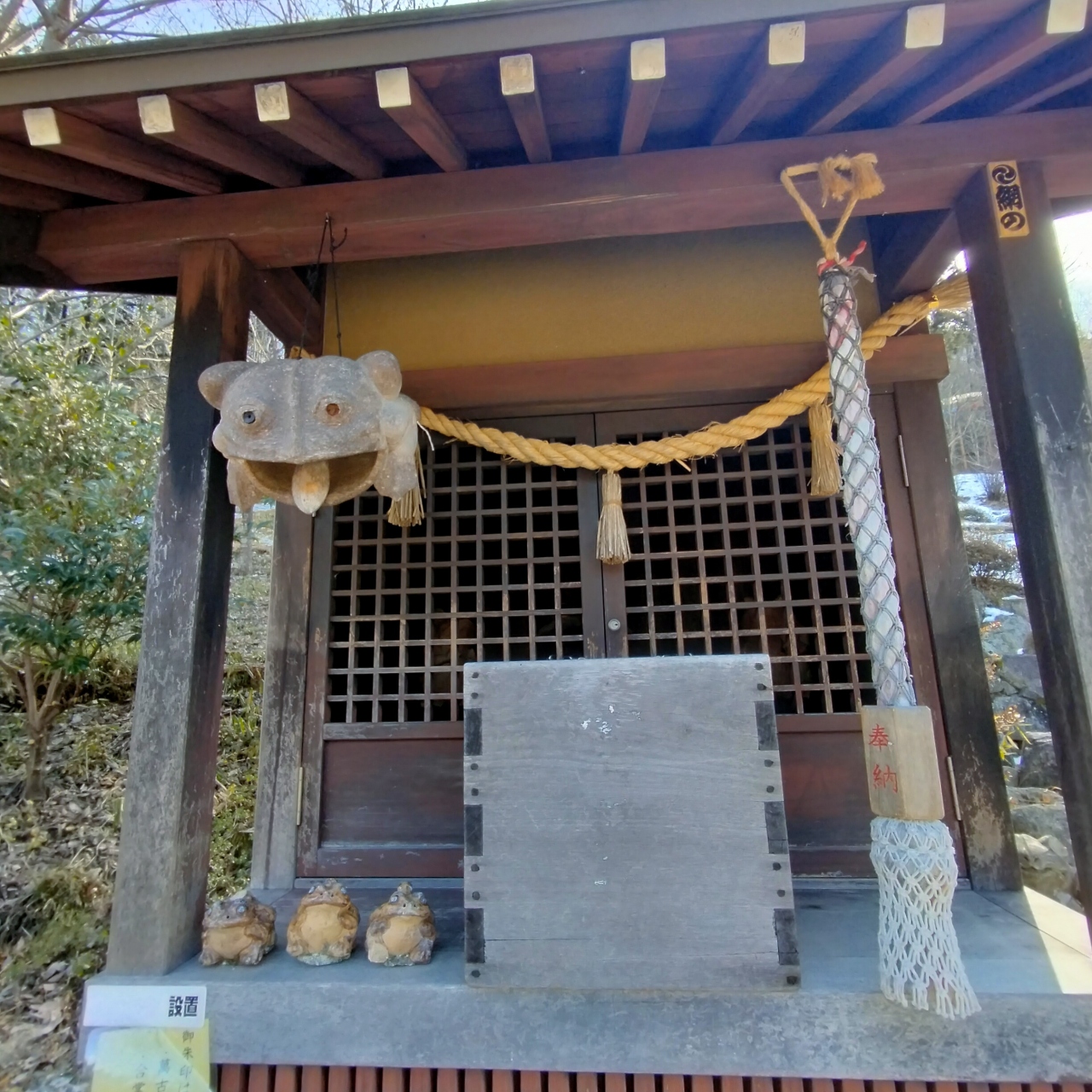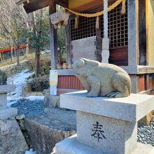 小さな祠があり、その両脇に「狛かえる」が並んでいました。