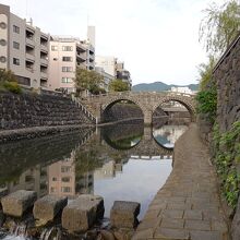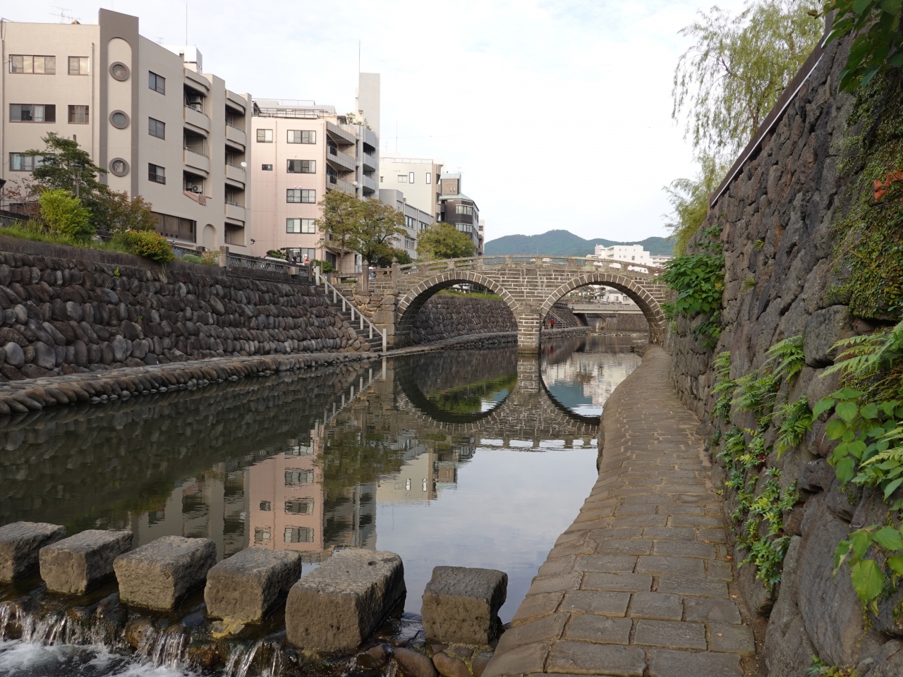新地中華街を訪れた後、眼鏡橋へ向かいました。一つ下流の袋橋から見る姿が良いようで、袋橋上で、結婚式の前撮りをしている人たちがいました。1634年、興福寺の黙子如定禅師が仮設したいわれている橋で、日本初のアーチ式石橋として、全国的に有名です。川面に移ったアーチの影が重なり、確かに眼鏡に見えます。
