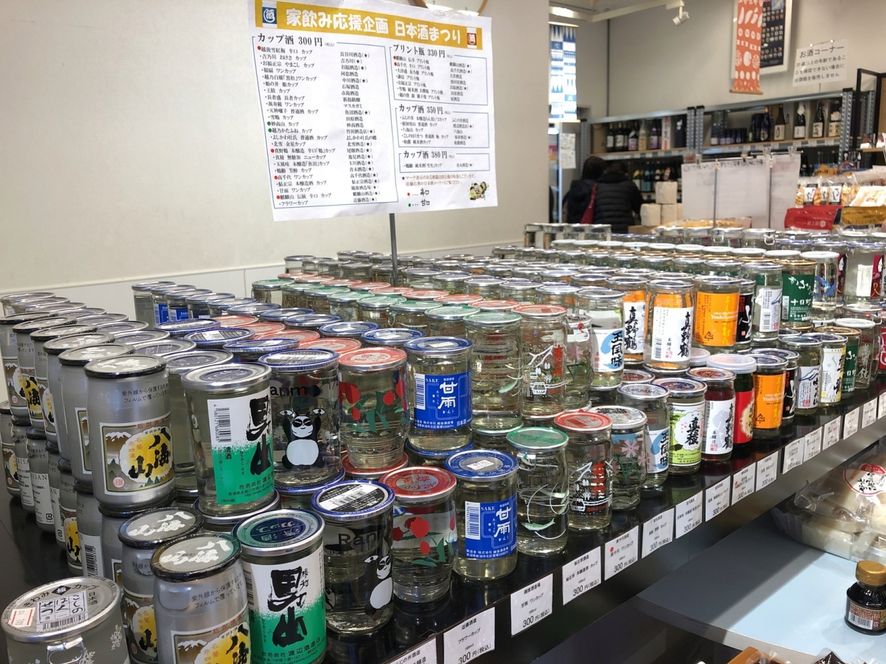 日本酒が豊富にそろっており、酒どころ新潟を前面に打ち出している様子でした。画像にもみられるようにカップ酒が驚くほど並んでおり、選ぶのに悩みました。個人的には純米酒が好きですが、経済的なカップ酒に純米酒があることはまれでした。