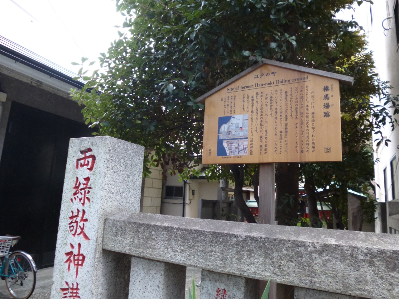都営大江戸線の両国駅からほど近い裏通り沿いにある「榛稲荷神社」の境内に「榛馬場跡」という高札があります。高札の記述によると、かつてこのあたりには、榛馬場と呼ばれた馬場があり、本所に住む武士の弓馬の稽古に使われたということです。また、そのことは、勝海舟の父の著書にも書かれているそうです。高札には江戸切絵図が描かれているものの、それだけでは往時の光景を想像することは出来ませんでした。